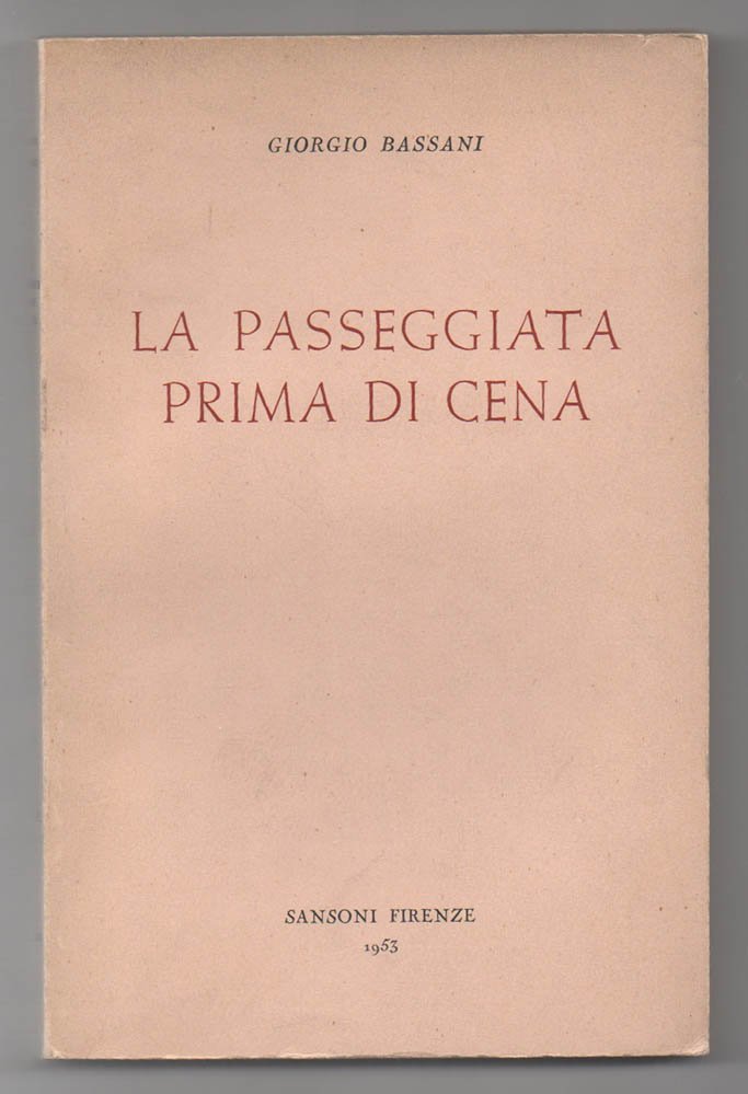 LIBRO Prima edizione. Ottimo esemplare, conserva la rara sovracoperta con minime mancanze perimetrali. Prime e ultime carte leggermente fiorite, per il resto lievemente brunite. Primo libro a riunire tre racconti che, assieme a due altri composti successivamente, andranno a comporre il primo libro della «Storia di Ferrara», quel «Dentro le mura» già apparso come «Cinque storie ferraresi» nel 1956. -- «Nel 1953 Sansoni pubblicò La passeggiata prima di cena che riuniva tre racconti apparsi in Botteghe oscure: il racconto eponimo del 1951 (ma di cui una prima stesura risaliva al 26 agosto 1945 su Domenica), Storia d’amore, rielaborazione del 1948 di Storia di Debora, e Una lapide in via Mazzini, edita nel 1952» (Simona Costa, voce DBI, 2016). Prebys, La bibliografia delle opere di Giorgio Bassani (2010), vol. I p. 46 (N45)