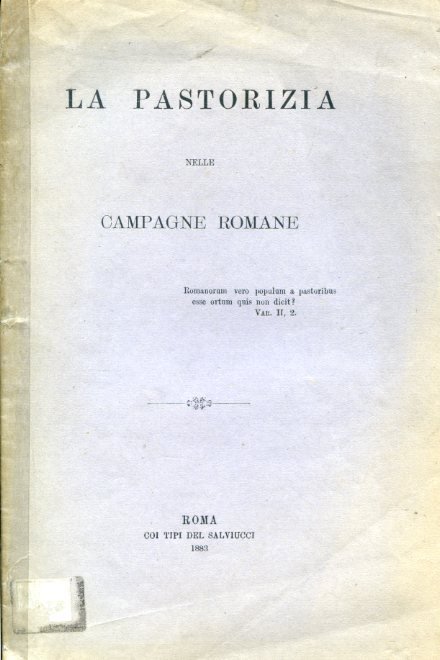 In-8°, pp. 44, brossura edit. violetta. Non comune opuscolo in cui l'anonimo estensore, probabilmente un latifondista, o, comunque, un difensore di interessi latifondisti, dopo un cenno storico sullo sviluppo agrario della campagna romana, difende la propria vocazione alla pastorizia. Prima e unica edizione. Niccoli, p. 548.