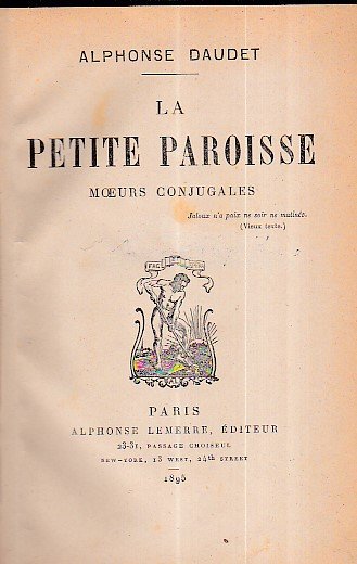 In-8°, pp. 452, (2), legatura del tempo m. tela verde. Ingialliture e fioriture sparse quanto usuali. Alcune gorette al taglio di centro. Prima edizione, nella tiratura su carta comune. La 'petite paroisse' che dà il titolo al romanzo è quella di Sainte-Hélène, presso la casa in cui a lungo Daudet dimorò a Draveil-Champrosay, alla periferia di Parigi.