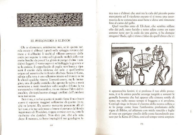In-16°, legatura editoriale in brossura con bandelle, pp. 107(5) Ristampa dell'edizione originale curata da Linati (1922) di questa 'raccolta di lettere erotiche e famgliari che il Lucini finge si siano scambiate fra loro alcuni gaudenti e cortigiane dell'epoca alessandrina'.