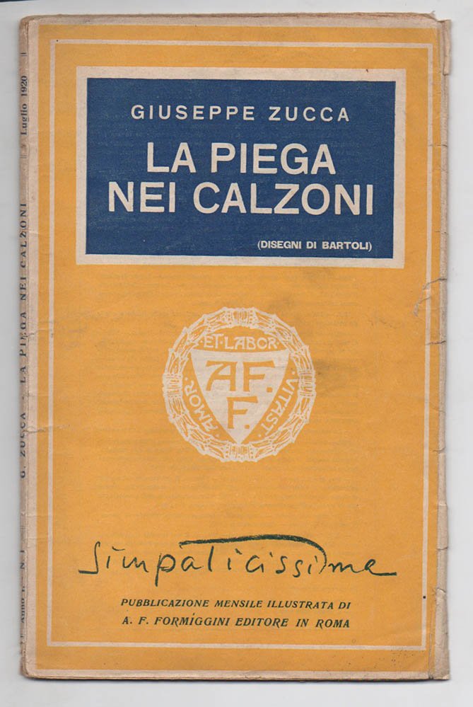 LIBROPrima edizione.Qualche menda al dorso, ma ottimo esemplare.Tra i più apprezzati umoristi della sua generazione, Giuseppe Zucca parlò della guerra in termini umoristici. Davanti alle critiche, si difese dicendo che già in tanti avevano scritto delle atrocità in trincea, mentre di «cose da ridere, gente scettica e sfaticata, superiori imbecilli […]» non aveva scritto «nessuno: o pochissimi», e difese la sua posizione come «lo sbigottimento un po’ sminchionato – eh sì: un po’ sminchionato – del bravo borghese, il quale, mediante la semplice inserzione del nome e cognome (Zucca sig. Giuseppe) in una pagina del Bollettino Militare, s’era visto, da un’ora all’altra, non soltanto soldato, ma ufficiale. E non soltanto ufficiale, ma ufficiale in guerra. E con tutto ciò, va avanti per conto suo a osservare le cose della milizia coi suoi soliti occhi – eh sì: un po’ scanzonati – di borghese» (pagina 3).