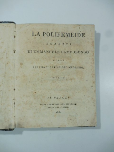 In 8 (cm 18 x 23), pp. (6) + 224. Un foglio a righe bianco aggiunto in fine di volume inserito nella legatura. Bruniture piu' diffuse al frontespizio e alla prima carta di sguardia, piu' sporadiche alle successive pagine. Legatura in mezza pelle coeva con nastro carta applicato ai tagli dei piatti. Terza edizione (edizione originale senza parafrasi latine 1759, con parafrasi latine 1769) di questa raccolta di 104 sonetti del latinista Emanuele Campolongo. "Il Campolongo fu elegante poeta italiano, e conoscitor profondo delle lingue dotte. Le di lui opere pero' piu' applaudite dal mondo letterario sono: La Mergellina, il Proteo, La Galleide, e la Polifemeide" (Gastaldi, Della Regale Accademia ercolanese dalla sua fondazione sinora.).