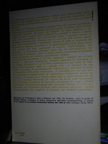 Salvatore La Francesca. Roma-Bari, Gius. Laterza & Figli, 1973. La Politica economica del fascismo. In-16°, cartoncino edit. 110, (1) pp. Firma di ex proprietà nella prima bianca. In ottimo stato di conservazione. Uff. pacco F. carc.