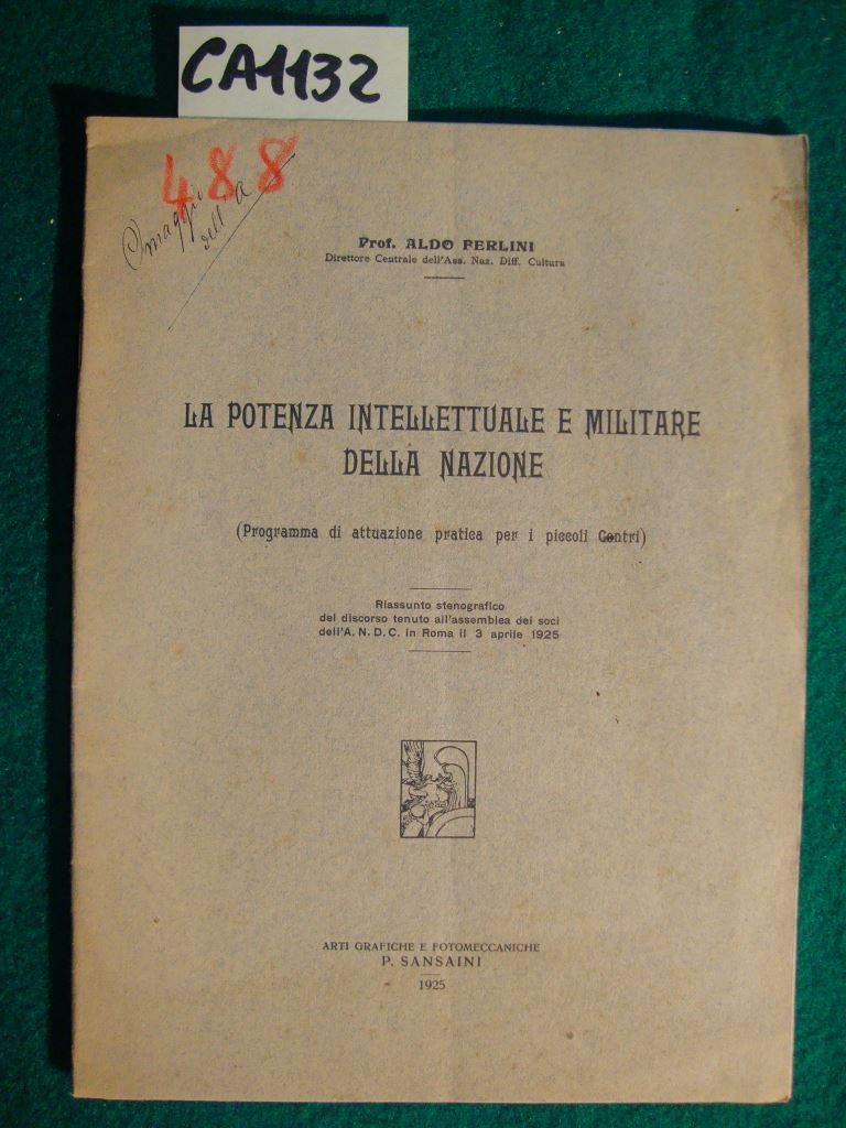 Opuscolo in brossura spillata con copertina editoriale a stampa; riassunto stenografico del discorso tenuto all'assemblea dei soci dell'A. N. D. C. (Associazione Nazionale Diffusione Cultura) in Roma il 3 Aprile 1925 - DETTAGLIO DELLE CONDIZIONI : Segni a matita colorata al piatto anteriore. Dicitura a penna - Omaggio dell'A. - ; minute e marginali fioriture - (33g).