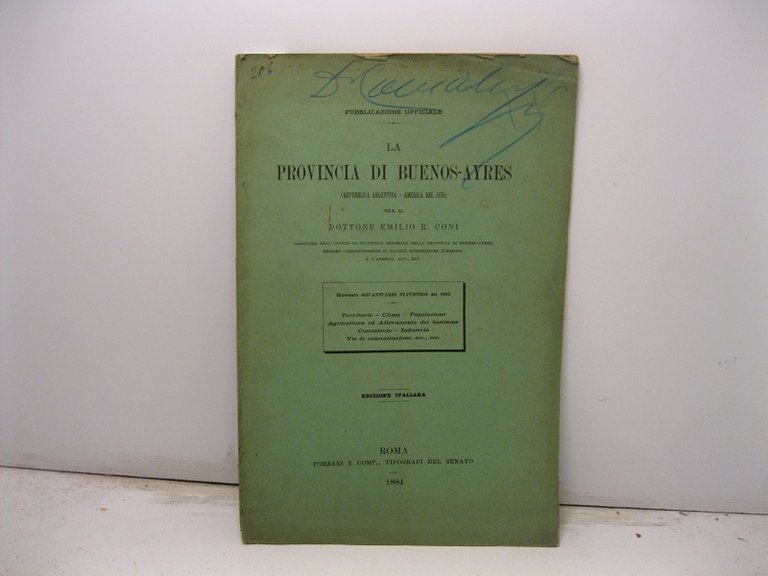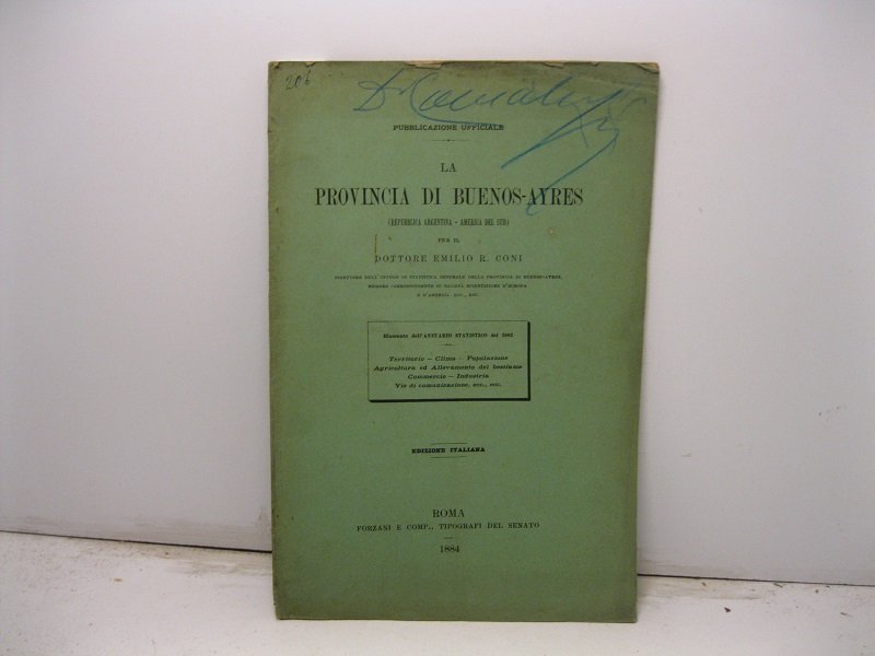 La provincia di Buenos-Ayres (Repubblica Argentina-America del Sud). Riassunto dell'Annuario statistico del 1882. Territorio, clima, popolazione, agricoltura ed allevamento del bestiame, commercio, industria, vie di comunicazione, ecc.