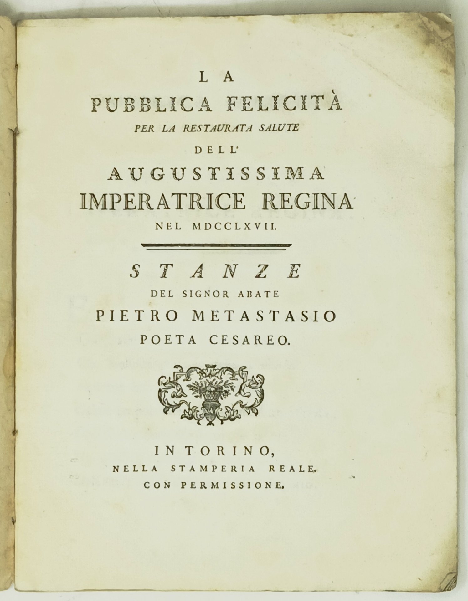 >in-4 (mm 215x167), pp. 24, brossura marmorizzata coeva. Stanze in rima a celebrazione della gioia generale dell'Impero per la guarigione della sovrana Maria Teresa dopo la pericolosa malattia che l'aveva colpita . L'opera si colloca nel contesto delle commemorazioni ufficiali del 1767. L'opera è talvolta presente nelle raccolte delle opere del Metastasio. Carta vergellata, ampi margini, freschissimo. Piccola macchia di umido in fine.