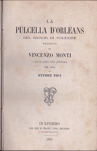 In-16° (182x118mm), pp. XXXII, 396, (4) di indice ed errata, legatura coeva p. percallina marrone con titolo in oro al dorso. Testatine e fregi tipografici ornati. Fioriture normali. Buon esemplare. Prima edizione integrale (in precedenza ne furono pubblicati soltanto alcuni parziali stralci) della traduzione del Monti della 'Pucelle d'Orléans', celebre poema eroicomico in decasillabi di Voltaire, ove la figura di Giovanna d'Arco è impietosamente dissacrata e tolta a pretesto per una feroce satira anticlericale. Opera tanto farraginosa e discontinua quanto ammirata a suo tempo da alcuni dei massimi scrittori europei (tra cui Goethe stesso), essa stravolge deliberatamente lo schema del poema cavalleresco ariosteo, infarcendolo di numerosi episodi a carattere licenzioso. La presente versione del Monti, pubblicata dal Toci a 50 anni di distanza dalla morte del poeta, fu da lui compiuta nel suo esilio parigino del 1800-1801, senza però che egli la desse alle stampe per il carattere giudicato troppo licenzioso del poema. 'Il manoscritto, custodito nella Biblioteca civica di Bergamo sotto divieto di pubblicazione, fu trascritto di nascosto e dato in luce a Livorno nel 1878' (Pompeati, Vincenzo Monti, Bologna, 1928, pp. 230-231). Precedono i 21 canti (di complessive 1178 ottave) due avvisi dell'editore, l'Avvertenza premessa all'edizione di Kehl' e la 'Prefazione di Don Apuleio Risorio benedettino', entrambe tradotte dal Toci; seguono, alle pp. 327-396, le note e varianti. Parenti, p. 356. Bustico, 334. Pompeati, cit. Sul testo della versione, v. Arnaldo Bruni, Per l'edizione critica della 'Pulcella d'Orleans' di Vincenzo Monti, Firenze, Accademia della Crusca, 1985.
