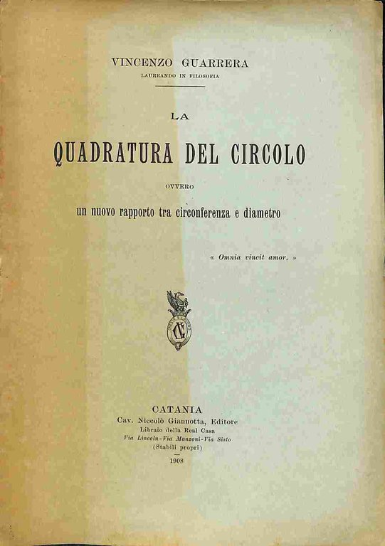 In 8 (cm 17 x 24), pp. 10 + (6) con 2 figure geometriche nel testo. Brossura editoriale. Saggio matematico in cui l'A. propone la sua soluzione del problema della quadratura del cerchio. Scrive Guarrera nell'introduzione: "I fratelli Edmondo Savigny di Parigi hanno recentemente annunziato nell'Exagramme, rivista da loro diretta, la soluzione di questo importante problema della quadratura. Certamente il procedimento della mia soluzione non coincidera' con quello dei fratelli Savigny, ma siccome il fine a cui tendiamo e' lo stesso, mi sono affrettato a pubblicare la mia soluzione cosi' come l'ho scritta fin dal 1906.".