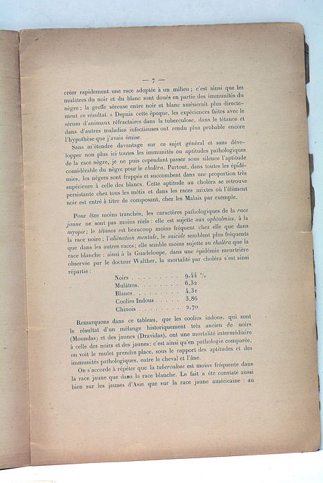 19 pages. (25x17 Cm). Broché. Couverture imprimée. Accrocs et petites déchirures. Rousseurs. Papier bruni. "Si les médecins et les chirurgiens se plaçaient plus souvent au point de vue qui vient de nous occuper, il est probable qu'ils arriveraient à des conclusions dignes d'intérêt sur l'aptitude ou l'immunité, la résistance opératoire du malade dans un pays donné, dans une famille donnée."