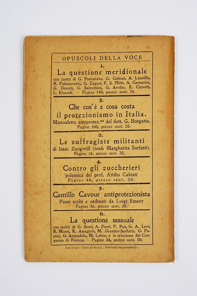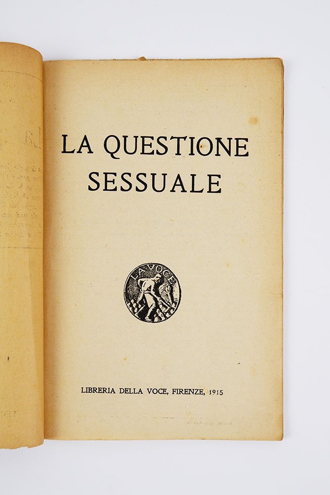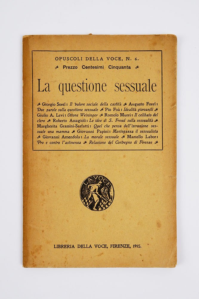LIBROPrima edizione.Ottimo esemplare (brunitura uniforme e qualche fioritura).Serie di saggi sulla sessualità. Tra gli autori spiccano, tra gli altri, i nomi di Sorel, Forel, Papini e Sarfatti.