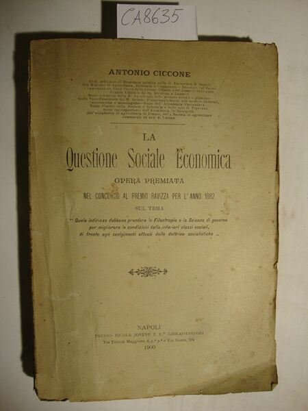 Opera premiata nel concorso al premio Ravizza per l'anno 1882 sul tema - Quale indirizzo debbano prendere la Filantropia e la Scienza di governo per migliorare le condizioni delle inferiori classi sociali, di fronte agli svolgimenti attuali delle dottrine socialistiche - - DETTAGLIO DELLE CONDIZIONI : Marcati segni d'invecchiamento con fioriture sparse. Danni con carenze al dorso. Segni da studio e fioriture sprse alle pagine non ledono tuttavia la leggibilità del testo - .