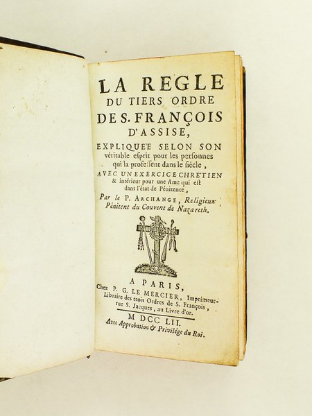 Rappel du titre complet : La Règle du Tiers Ordre de S. François d'Assise, expliquée selon son véritable esprit pour les personnes qui la professent dans le siècle, avec un exercice chrétien & intérieur pour une Ame qui est dans l'état de Pénitence. Etat satisfaisant (rel. frottée avec petit mq. en dos et coiffe sup.)