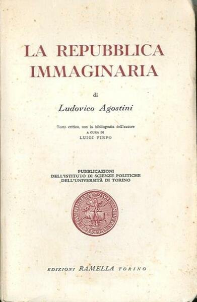 187 p. ; 23 x 15 cm. Pubblicazioni dell'Istituto di scienze politiche dell'Università di Torino, 4. Questo dialogo di Agostini, «La repubblica immaginaria», scritto verso la fine degli anni '80 del '500 è ispirato sia nella forma che nello spirito all'Utopia di Thomas More. L’opera rimase manoscritta a Pesaro fino alla metà del XX secolo, quando lo storico Luigi Firpo la riscattò dall'oblio, riscoprendola «nelle pagine confuse e stente d'un suo zibaldone di considerazioni sul Genesi e l'Esodo stese in forma dialogica». Firpo definì «La repubblica immaginaria» un « compiuto progetto di Stato ideale, che assicura a buon diritto [ad Agostini] un suo luogo non trascurabile nella storia dell'utopia politica e sociale"[5]. L'opera occupa un ruolo importante nella fase di transizione dalla cultura rinascimentale alla Controriforma. Testo critico, con la bibliografia dell'autore, a cura di Luigi Firpo. Brossura editoriale, coperta in cartoncino flessibile con titolo impresso al piatto e al dorso. Leggeri segni del tempo ai risvolti della coperta, per il resto libro integro e intonso. Codice libreria 7724.