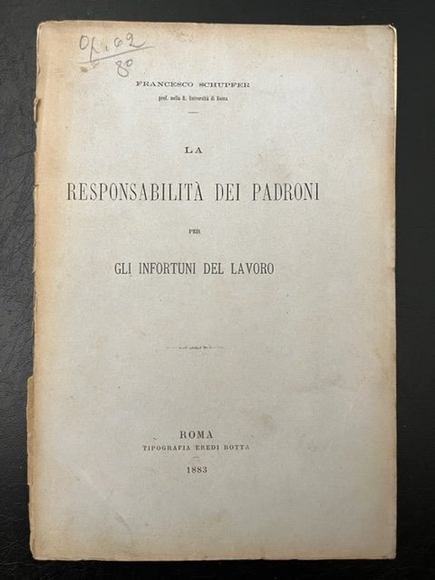 In 8 (cm 15,5 x 22,5), pp. 45 + (3 bianche). Piatto anteriore in brossura editoriale, piatto posteriore rifatto con carta d'epoca. Saggio di Francesco Schupfer, storico del diritto, sulle responsabilita' del datore di lavoro in caso di infortuni sul lavoro. L'A. richiama l'esperienza di Germania e Svizzera, che emanarono leggi sull'inversione dell'onere della prova a carico del padrone e non del lavoratore, e si spinge a giustificare una soluzione del genere gia' alla luce del diritto vigente.
