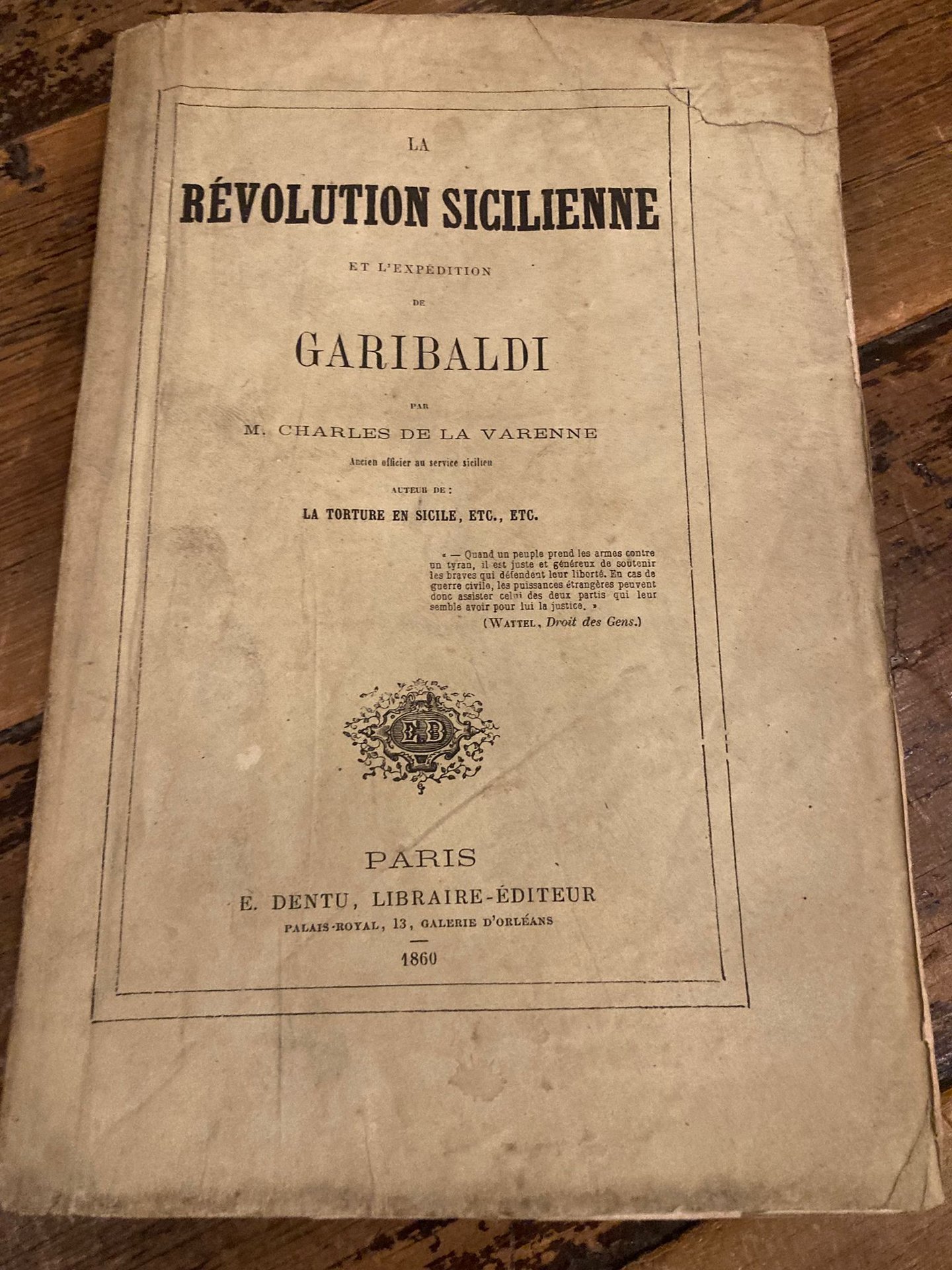 In-4° (25x17.5 cm), pp. (4) IV 255 (1), brossura editoriale con titoli al dorso e al piatto anteriore. Minimi segni del tempo e d' uso ai piatti (restauri conservativi, minima mancanza al piatto posteriore), interno molto fresco. Più che buon esemplare a fogli chiusi. Edizione originale di questa puntuale cronaca dei moti rivoluzionari palermitani e della spedizione dei mille. M. Ch. de la Varenne (1828-1867) fu militare di stanza in Sicilia e pubblicista francese, amatissimo in Italia. Scrisse numerose opere ed articoli concernenti il Risorgimento, l'Italia e la sua situazione, tra le quali ricordiamo il rapporto sulla strage di Torino del settembre 1864.