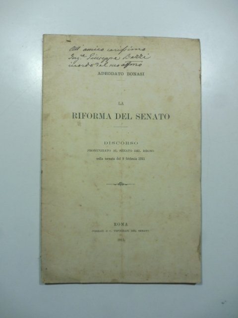 In 8 (cm 14,5 x 22,5), pp. 15 + (1b). Brossura editoriale con dedica autografa al piatto anteriore. Discorso pronunciato in Senato nella tornata del 9 febbraio 1911.