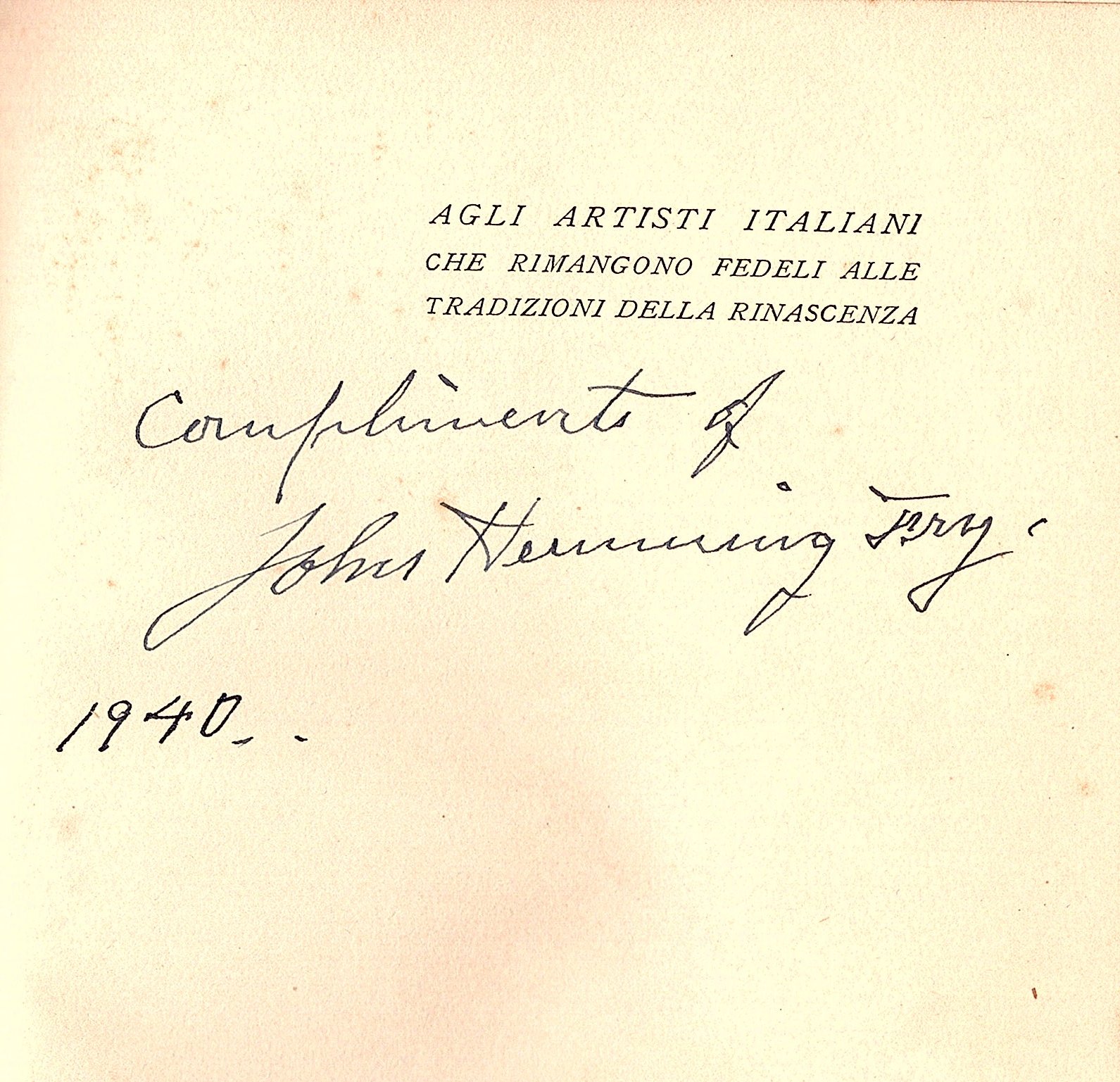 In-8° (22x16 cm), elegante mezza tela editoriale gialla con titoli su tasselli cartacei applicati al dorso e al piatto anteriore, piatti parzialmente rivestiti di carta uso mano azzurra, sovracoperta ad alette paratestuali. Pp XLIII, 303, (1), 1 tavola a specchio del frontespizio e disegni in b/n nel testo (testate e finali). Piccola mancanza al piede del piatto anteriore della sovracoperta che presenta lievi fioriture, interno molto fresco. Bell'esemplare in barbe protetto da velina con al frontespizio firma di appartenenza della pittrice ligure Rita Saglietto con dedica autografa del autore alla pagina di dedica a stampa 'Agli artisti italiani che rimangono fedeli alla tradizioni della rinascenza'. Seconda edizione di questo controverso saggio antiavanguardista e antimodernista teso a difendere la concezione classico-romantica della nozione di bello in ternini di estetica filosofica.