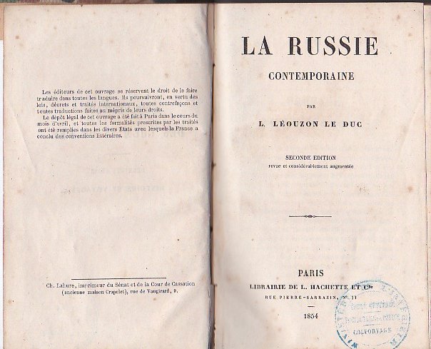 In-16°, pp. (2), XIV, 4440, legatura di fine Ottocento m. percallina con filetti in oro al dorso. Piatti in cartone marmorizzato policromo. Timbro ottocentesco di colportage al frontespizio. Bell'esemplare con fioriture usuali. Seconda edizione, riveduta e ampliata rispetto alla prima del 1853, edita nella seconda serie della 'Bibliothèque des Chemins de Fer'. Dettagliato studio sulla Russia della metà del secolo decimonono: San Pietroburgo e Mosca, Nicola I e la famiglia imperiale, l'amministrazione, la vita sociale, le feste popolari e le processioni religiose, la Chiesa ortodossa, l'istruzione pubblica, la letteratura e le arti, la massoneria, le sette religiose dissidenti ed eterodosse, la servitù della gleba, l'economia, il commercio, l'industria, le esportazioni tra Russia e Francia, l'esercito e la marina, la polizia, ecc. Léouzon Le Duc (Digione, 1815-Parigi, 1889), poligrafo ed avvocato, lasciò numerosi volumi sulla Russia e sulla Scandinavia, territori in cui aveva a lungo risieduto e che conosceva profondamente. Fu lui a scegliere, in Finlandia, il porfido rosso destinato alla tomba di Napoleone agli Invalides.