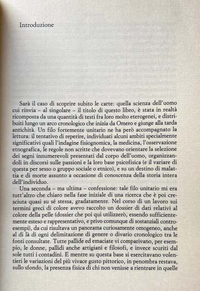 Questo libro di Maria Michela Sassi è una ricostruzione generale di ciò che i Greci pensarono dell'uomo dal secolo V a.C. fino alla tarda antichità, fondata sull'esplorazione di un'amplissima gamma di testimonianze che va dai testi letterari all'iconografia, dagli scritti di medici alla letteratura fisiognomica, dalle Storie di Erodoto alle opere di Platone, Aristotele e Posidonio: fonti riconducibili a saperi diversi e apparentemente senza relazioni tra loro, ma accomunati da quel senso acuto della differenza che innesca il meccanismo della curiosità antropologica. Differenza fra uomini e donne, fra liberi e schiavi, fra Greci e barbari, vista con gli occhi del greco maschio e libero. Differenza impressa nei segni del corpo, che distinguono gli individui l'uno dall'altro e sono insieme elementi di tipologie fisiche e culturali, cosicché il colore della pelle è nello stesso tempo indizio di carattere per il fisiognomico, di malattia per il medico e di gruppo etnico per l'etnologo. Punto d'approdo è la rivelazione di un’immagine inedita di un'area importante della scienza greca, resa possibile da un'indagine filologica attenta alle tematiche della moderna antropologia e dalla preoccupazione storiografica che ha ispirato il lavoro: capire cosa significasse pensare scientificamente in una cultura che è alle origini della nostra.