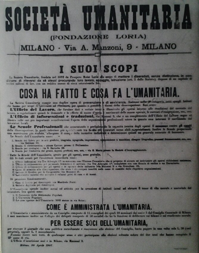 LA SOCIETA' UMANITARIA 1893/1963. - Fondazione P.M. Loria Milano.