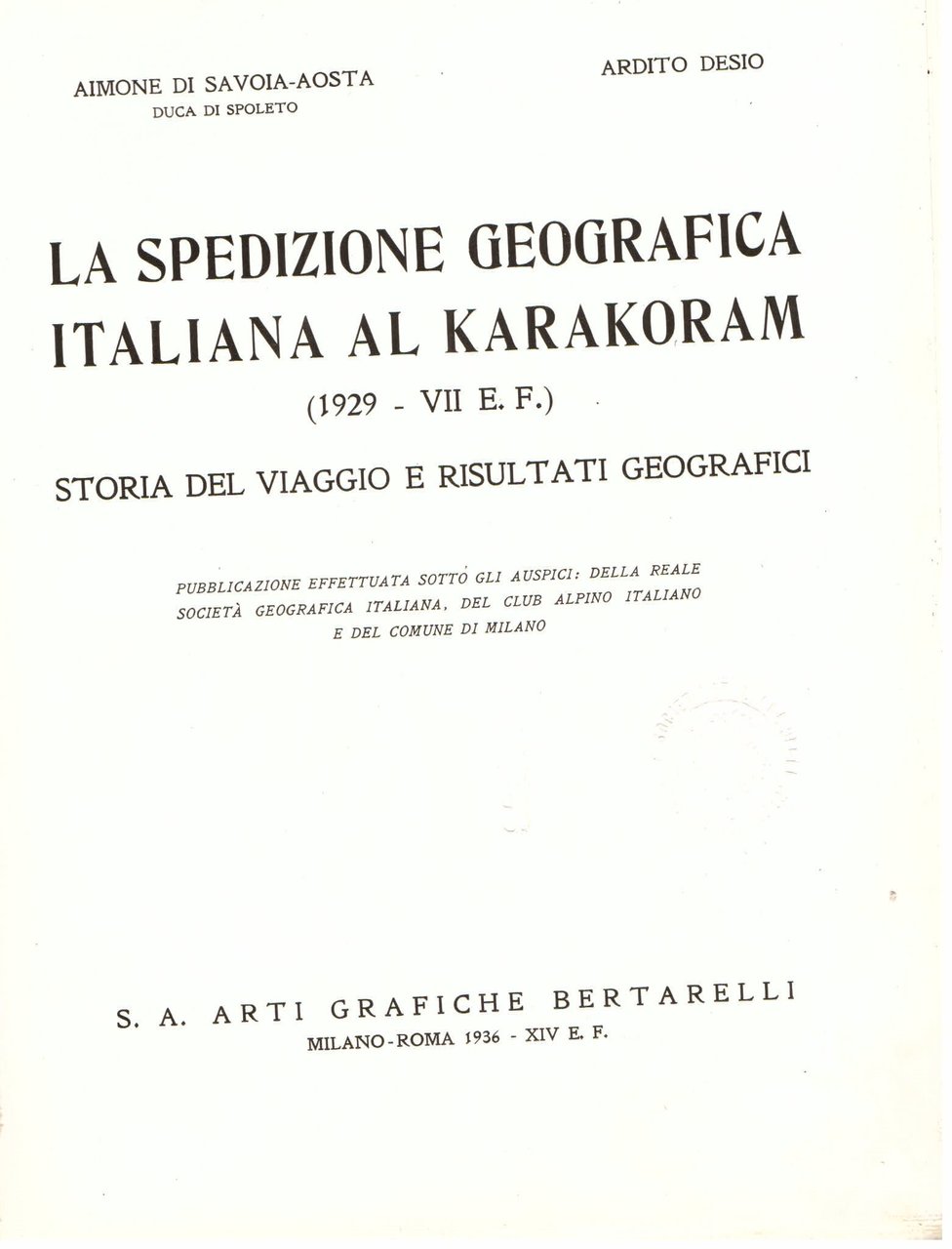 La spedizione geografica italiana al Karakoram (1929 - VII E. F.). Storia del viaggio e risultati geografici. Pubblicazione effettuata sotto gli auspici della Reale Società Geografica Italiana, del Club Alpino Italiano e del Comune di Milano