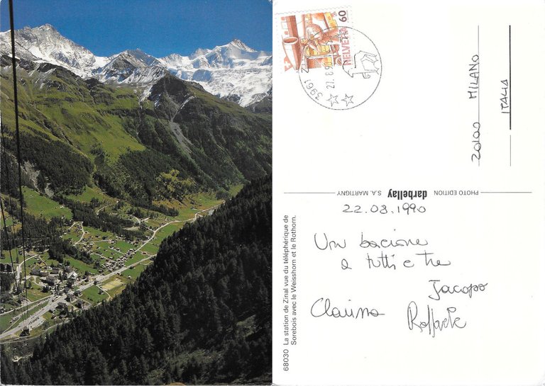 La station de Zinal vue du téléphérique de Sorebis. Viaggiata 1990