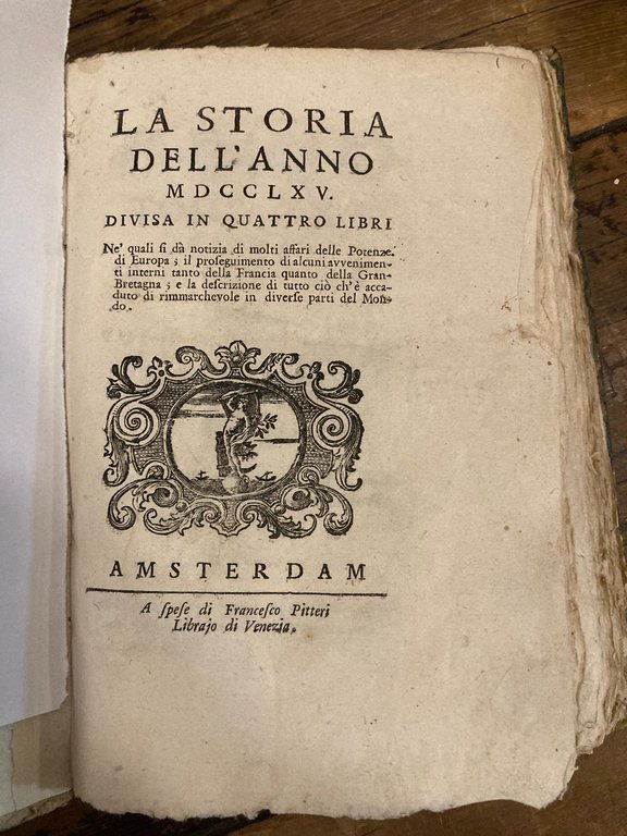 In-8° antico (18x13 cm), pp. 320, brossura muta coeva in carta decorata marmorizzata verde. Vignetta al frontespizio; capolèttere animati, testatine e finali incisi. Più che buon esemplare in barbe. Non comune annata di questa longeva serie di che raccoglieva con cadenza annuale 'avvisi' relativi a vicende militari, politiche europee e di ogni paese del mondo. Si segnalano notizie sugli ampliamenti dei porti di Brest e di Have; morte del Duca di Parma.