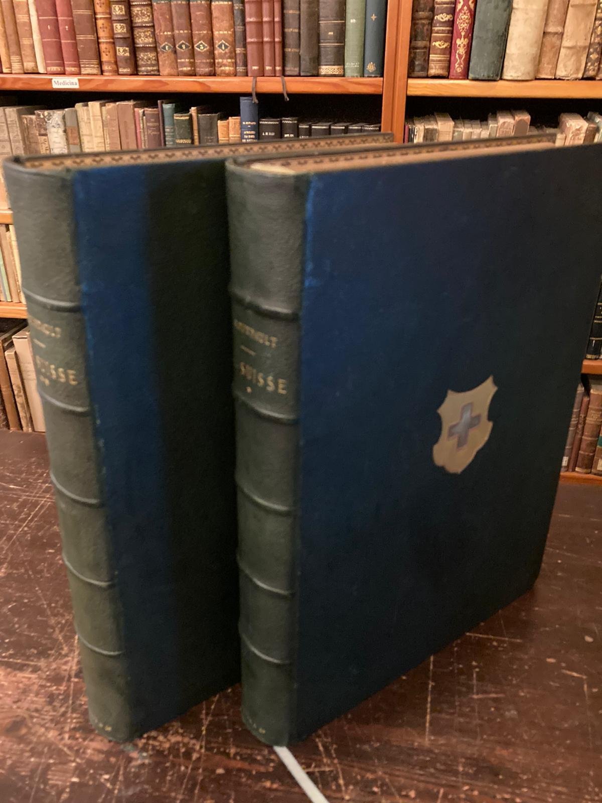 2 volumi in folio, (380x290mm), pp. VI, 714; 2ff., 722, splendide legature coeve in piena pelle verde con stemma svizzero in oro ai piatti e titolo in oro su dorsi a nervi, tagli dorati, sguardie decorate. Numerose tavv. xilografiche n.t. e f.t., di cui una all'antiporta, con suggestive vedute dell'intero territorio elvetico. Ottimo esemplare. Edizione originale e di lusso di questa classica opera descrittiva sulla Svizzera, ricca di osservazioni relative alle Alpi elvetiche. Bibliothèque des Écoles et des Familles. Perret, 2018: 'Un ouvrage descriptif sur la Suisse. Un classique'. Gattlen, Valais, II, 3617-3620. A.C.L., p. 133. Manca al S.A.C.