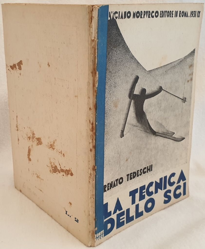 Interessante volume sulle tecniche dello sci del 1931 scritto da Renato Tedeschi. Bella copertina illustrata da Fonte Maggi in stile futurista. Nella prima parte l'autore descrive lo sport dello sci e le attrezzature che occorrevano, poi analizza tutte le varie tecniche (marcia in piano, salita, dietro fronte, discesa, frenaggi, voltate ed arresti, telemark, cristania, salto di voltata e d'arresto, salto su pista, le applicazioni dello sci ecc.). Numerose figure nel testo. In buone condizioni. Brossura editoriale in buone condizioni generali con lievi usure ai margini e dorso. Legatura in discrete condizioni con lievi rotture. All'interno le pagine si presentano in buone condizioni con fioriture. In 16. Dim. 17x12 cm. Pp. 60+(4).Interesting volume about techniques of skiing of 1931 written by Renato Tedeschi. Beautiful cover illustrated by Fonte Maggi in futuristic style. In the first part the author describes the sport of skiing and the the tools used, then he analyzes all the techniques. Different figures in the text. In good conditions. Editorial cover in good general conditions slightly worn in the edges and spine. Binding in fair conditions with slight cracks. Inside pages are in good conditions with foxings. In 16. Dim. 17x12 cm. Pp. 60+(4).