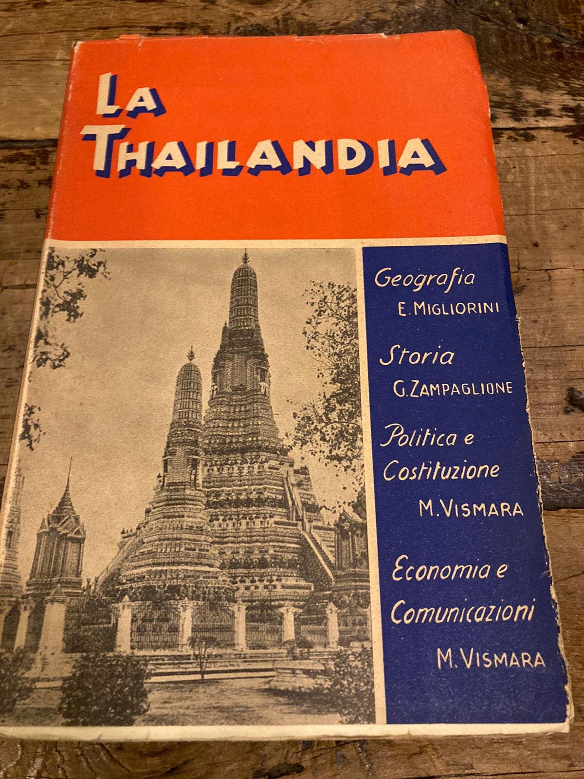 In-8° (22x14.5 cm), cartoncino floscio editoriale con titoli al dorso e al piatto anteriore, sovracoperta figurata fotograficamente. Pp 354, 18 tavole fotografiche in bianco e nero fuori testo, cartine e tabelle intercalate al testo. Fresco esemplare per la gran aprte a fogli chiusi completo della sovracoperta spesso assente. Pionieristico studio a sei mani dello stato del sud-est asiatico forse per la prima volta così nominato in Italia (fino al 1939 si chiamava Siam).