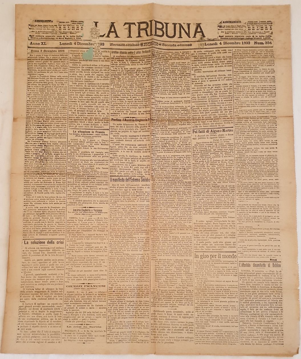 Numero del 4 dicembre 1893 del quotidiano "La Tribuna" fondato a Roma nel 1883 dai politici Alfredo Baccarini e Giuseppe Zanardelli. Venne pubblicato fino al Novembre 1946.<BR>All'interno: La bomba di Rochefort in Francia, L'ultimo attentato contro il Principe Ferdinando, Pei fatti di Aigues Mortes, Austria Ungheria e Vaticano, La crisi in Serbia, L'attentato dinamitardo di Dublino, Disastro di Limito, Cronaca friulana, Le corse velocipedistiche a Tor di Quinto, Riforma sulla educazione fisica ecc. In buone condizioni. Raro. Brossura editoriale in buone condizioni generali con lievi usure ai margini e dorso. Piegature. Legatura assente. All'interno le pagine si presentano in buone condizioni con rare fioriture. Parte mancante alla prima pagina con perdita di testo. Parte mancante alla prima pagina con perdita di testo. In folio. Dim. 55,5x45,5 cm. Pp. 4. Number of the 4th of december 1893 of the daily magazine "La Tribuna" established in Rome in 1883 by the politicians Alfredo Baccarini and Giuseppe Zanardelli. It was published until the november 1946. Inside: Bomb of Rochefort in France, The last attack to Prince Ferdinando, The happenings of Aigues Mortes, Austria Ungheria e Vaticano, Crisis in Serbia, dinamite attack to Dublin, Disaster of Limito, Friuli chronicle, Tor di Quinto, Reformation about physical education. In good conditions. Editorial cover in good general conditions slightly worn in the edges and spine. Foldings. Binding lacks. Inside pages are in good conditions with occasional foxings. Missing part in the first page with loss of text. In folio. Dim. 55,5x45,5 cm. Pp. 4.