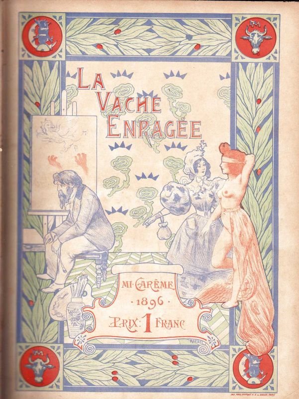 Fascicoli In-folio (cm 40,8 x 29,8), rilegati in un vol. in mezza pelle con tit. in oro al dorso. La raccolta si apre con il n. 1 dell'11 Marzo 1896 de La Vache Enragée - numero dedicato ai festeggiamenti di mezzaquaresima (Mi-Carème); copertina litografica a colori di Roedel, pp. 14(2). Seguono tre numeri di Au Quartier Latin - Organe de la Cavalcade des Etudiants, anche questi per i festeggiamenti carnevaleschi degli anni 1894, 1895 e 1896; rispettivamente pp. 24 - 40 - 30. Tra i collaboratori dell'importante rivista si ricordano: per poesie e testi di Loti, Goncourt, Mallarmé, Zola, Legrand, Barrès, Nolhac, Rodenbach, Renard, Dumas, Mendès, Houssaye, Régnier, Montoya, Lorrain, Faguet, Drumont, Tardieu, Meunier e altri; per le illustrazioni di Willette, Puvis de Chavannes, Bac, Pille, Guillaume, Henriot, Mars, Draner, Hirsch, Duran, Ropt, Jeanniot, Lunel, Oury e altri. La Promenade - o Cavalcade - de la Vache Enragée fu un corteo carnascialesco organizzato a Montmartre nel 1896 e 1897 dagli artisti e dagli abitanti del quartiere, in risposta ai grandi cortei del Bœuf Gras, cuore delle feste carnevalesche parigine, che quegli anni sfilarono nuovamente e in pompa magna per la prima volta dal 1870. Al primo contropiatto ex-libris di Bernard Sancholle-Henraux, inciso. Volume allentato, con ampie mancanze al dorso; buono lo stato di conservazione dei fascicoli.