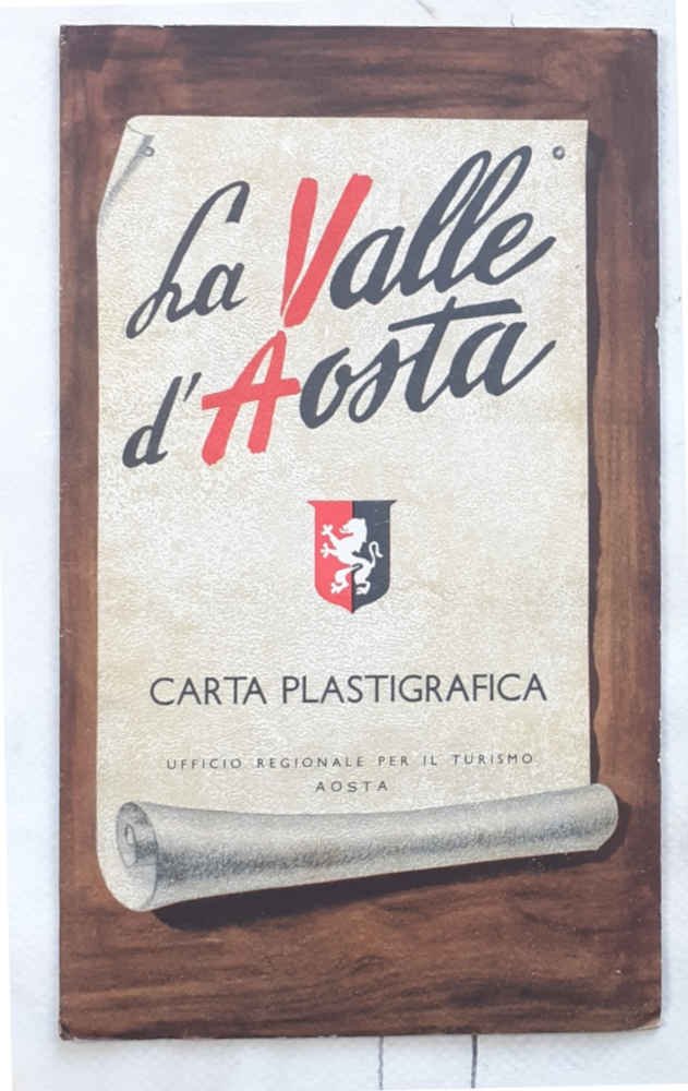 Carta geografica a volo d'uccello e in rilievo, a pieni colori di cm. 47 x 21, con al verso numer. illustraz. fotograf. in nero, ripiegata nella sua copertina originale figurata a colori, con bella illustazione di Musati in quarta che rappresenta un pastorello seduto su una staccionata con il Monte Bianco sullo sfondo. VG.