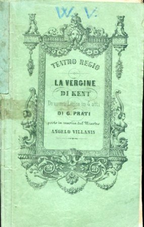 In-16°, pp. 43, brossura editoriale verde con titolo entro cornice figurata. Qualche fioritura e traccia d'uso. Prima edizione del libretto, scritto da Giovanni Prati (fra i maggiori poeti dell'Italia del tempo), di quest'opera del noto compositore piemontese, ambientata in un'Inghilterra ultraromantica e di derivazione scottiana. Contiene l'elenco degli interpreti e dei tecnici.