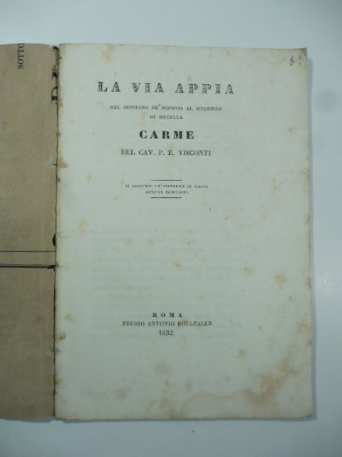 In 8 (cm 15 x 21,5), pp. 61 + (3b=. Brossura muta coeva. Bruniture alle pagine. Carme dedicato alla via Appia preceduto da un'introduzione di carattere storico e da un'appendice con scelta di alcune iscrizioni sepolcrali antiche.