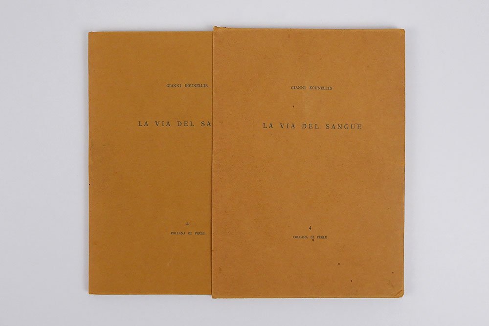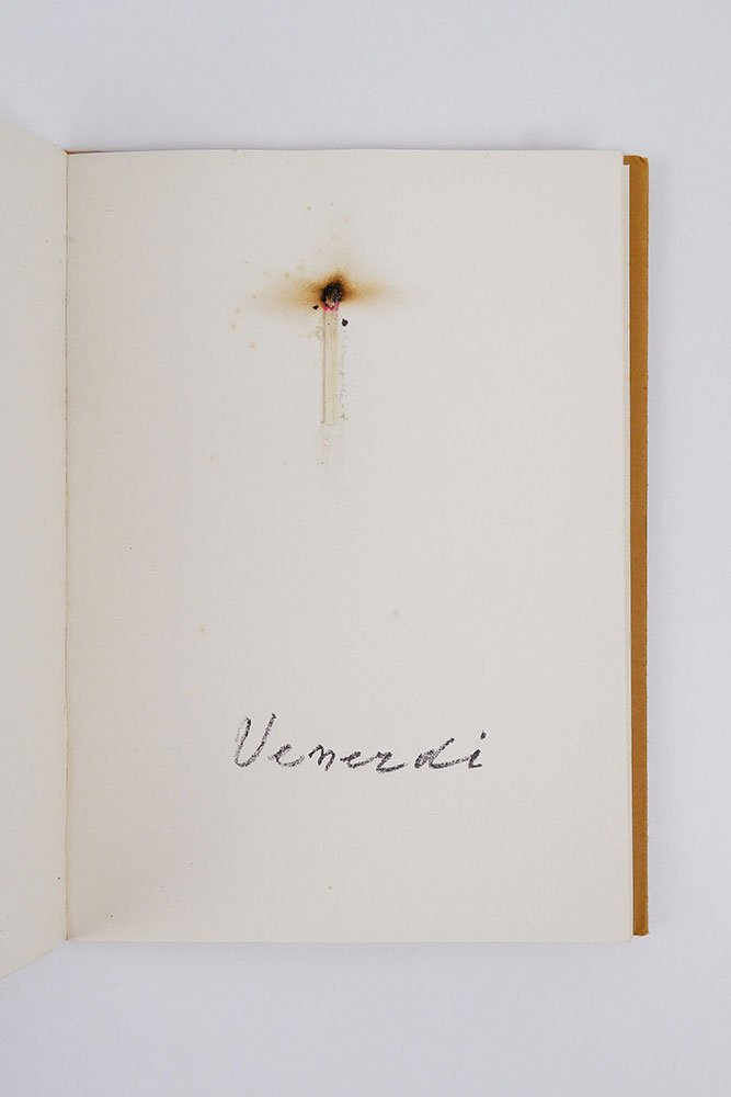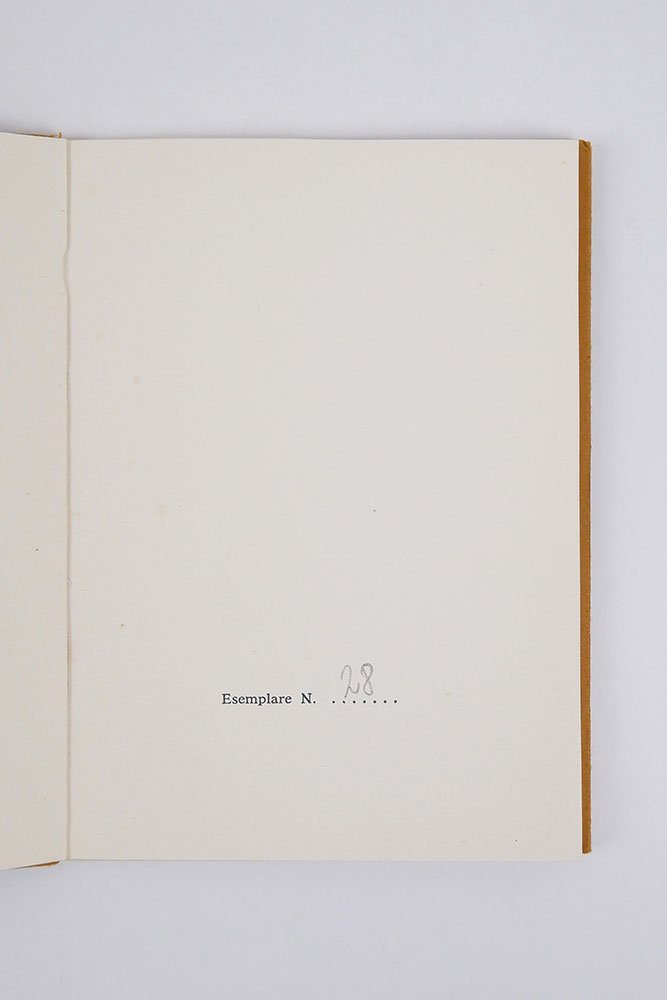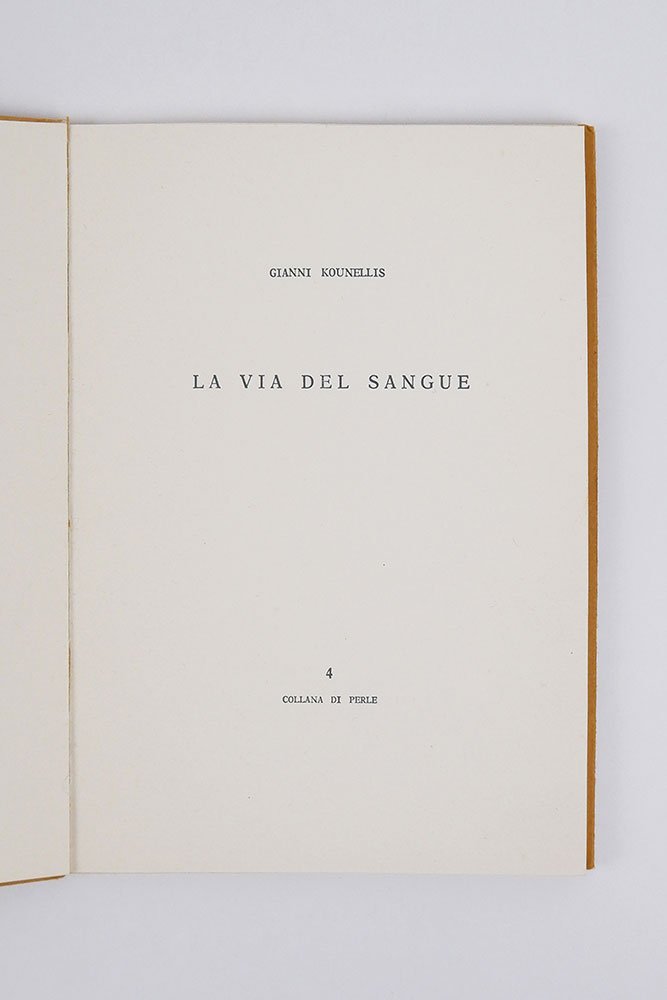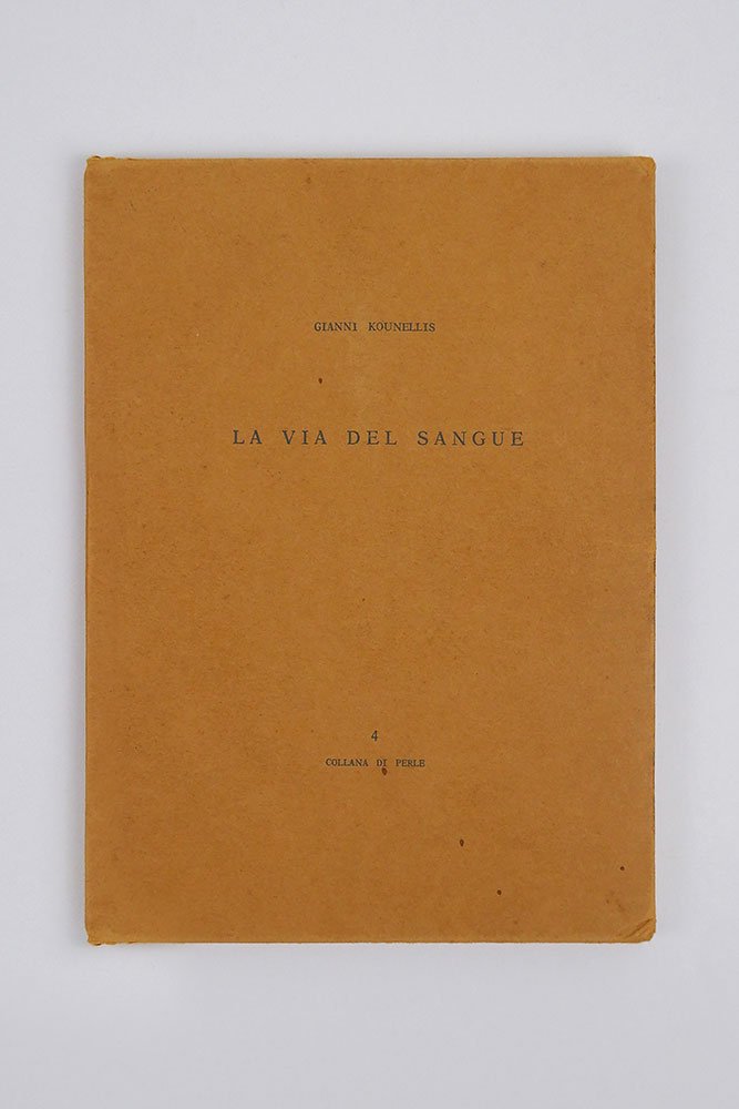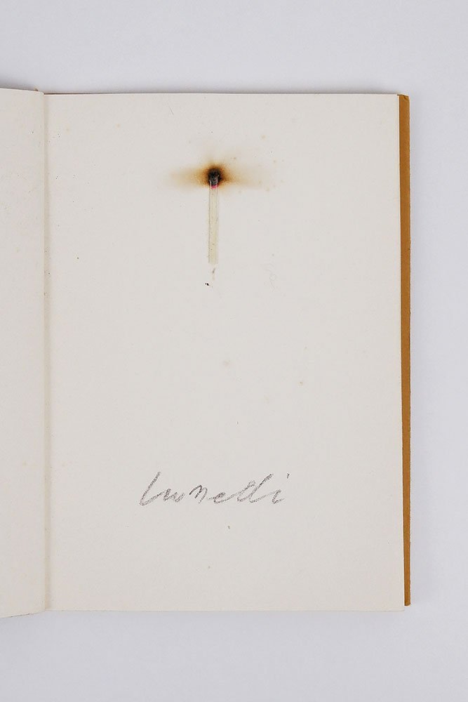 LIBROEdizione originale.CON AUTOGRAFO.Esemplare n. 28 della tiratura di 250 esemplari in commercio, firmati dall’artista. In ottime condizioni, completo in ogni sua parte.Materica e spesso segnata da un ritorno a una ritualità originaria, quasi primitiva, l’«Arte povera» — movimento nato ufficialmente nel 1967 grazie al famoso articolo-manifesto del critico Germano Celant «Arte povera: appunti per una guerriglia» («Flash Art» 5, novembre-dicembre 1967) — trova in questo bellissimo libro d’artista di Jannis Kounellis uno dei suoi punti più esemplari. Nato al Pireo ma residente a Roma dalla fine degli anni Cinquanta, il pittore e scultore greco realizza qui un’opera figlia della performance messa in scena alla galleria romana La Salita a partire dal 16 marzo 1973 in occasione della mostra dedicata ad Apollo. Ogni giorno per sette giorni Kounellis, dopo aver indossato una maschera di gesso del dio delle arti e delle scienze, accendeva un cerino e lo attaccava sopra un foglio di carta su cui era riportato il giorno della settimana. Leggermente tracciata dalla combustione ancora in atto, la pagina diventava così al tempo stesso simbolo dell’evanescenza del fuoco e della sua permanenza, rimandando al passaggio del tempo e alla sua sopravvivenza nella memoria. Un gesto individuale e collettivo insieme, celebrato dall’artista e dagli spettatori di quell’evento che questo libro — tirato in soli 250 esemplari numerati e firmati (a cui si aggiungono 30 esemplari fuori commercio e 10 prove d’artista) — rinnova con la sua forma essenziale eppure potentemente evocativa, intrisa di quella sacralità ritualizzata tanto importante per Kounellis che trova nel fuoco un simbolo di esaltazione, purificazione e rinascita dell’umano.Bibl. Maffei, Arte Povera 1966-1980, pp. 90-91.