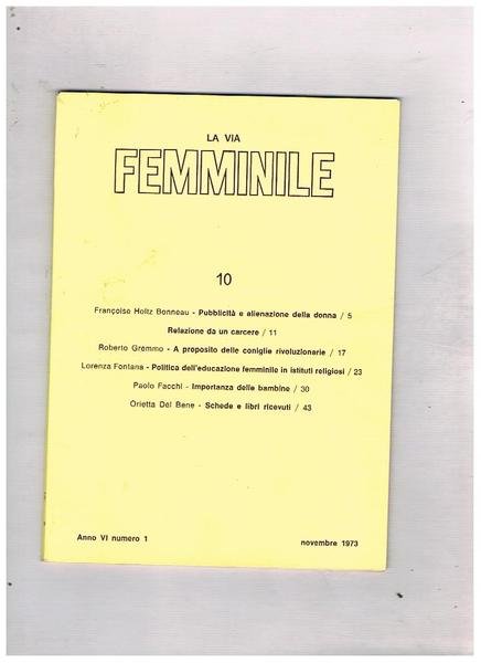 La via femminile, pubblicazione trimestrale n° 10 anno VI n° 1 nov. 1973. Relazione da un caecere; politica dell'educazione femminile in istituti religiosi; ecc.