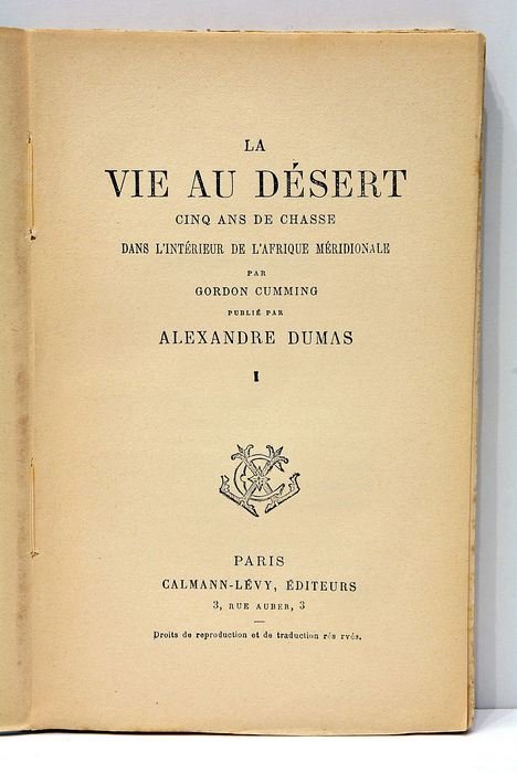 Tome I seul. 288 pages. 2 feuillets. (19x12cm). Broché. Couverture imprimée brunie et légèrement salie avec petites taches éparses. Dos frotté et coins émoussés. Publié à Paris, "La vie au désert" par Gordon Cumming, avec une préface d'Alexandre Dumas, plonge le lecteur dans l'univers de la chasse et de l'exploration en Afrique méridionale au XIXe siècle. L'ouvrage, premier tome d'une série, détaille les aventures et observations de Cumming durant cinq années passées dans des territoires alors peu connus des Européens. À une époque où l'Europe s'intéressait de près aux territoires africains pour leurs potentiels commerciaux et scientifiques, ce récit offre un témoignage sur la confrontation entre deux mondes. La préface d'Alexandre Dumas, figure littéraire majeure de l'époque, souligne l'intérêt contemporain pour les récits d'exploration et d'aventure, tout en offrant une caution littéraire à l'expédition de Cumming. Papier bruni avec petites taches et légères rousseurs. Exemplaire partiallement non-coupé. Cahier un peu déboîté. Tome I seul.
