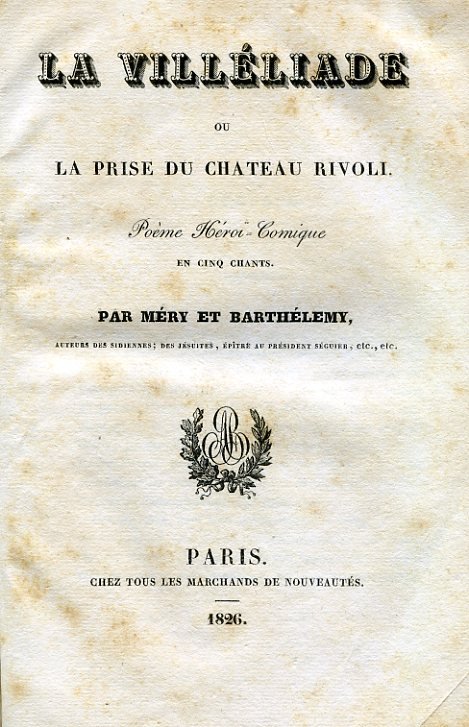 In-8°, pp. 83, cartonatura posteriore con titolo calligrafato al piatto. Fioriture sparse. Buon esemplare. Edizione originale di questo poema eroicomico volto a satireggiare i membri della Camera dei Deputati di Francia.