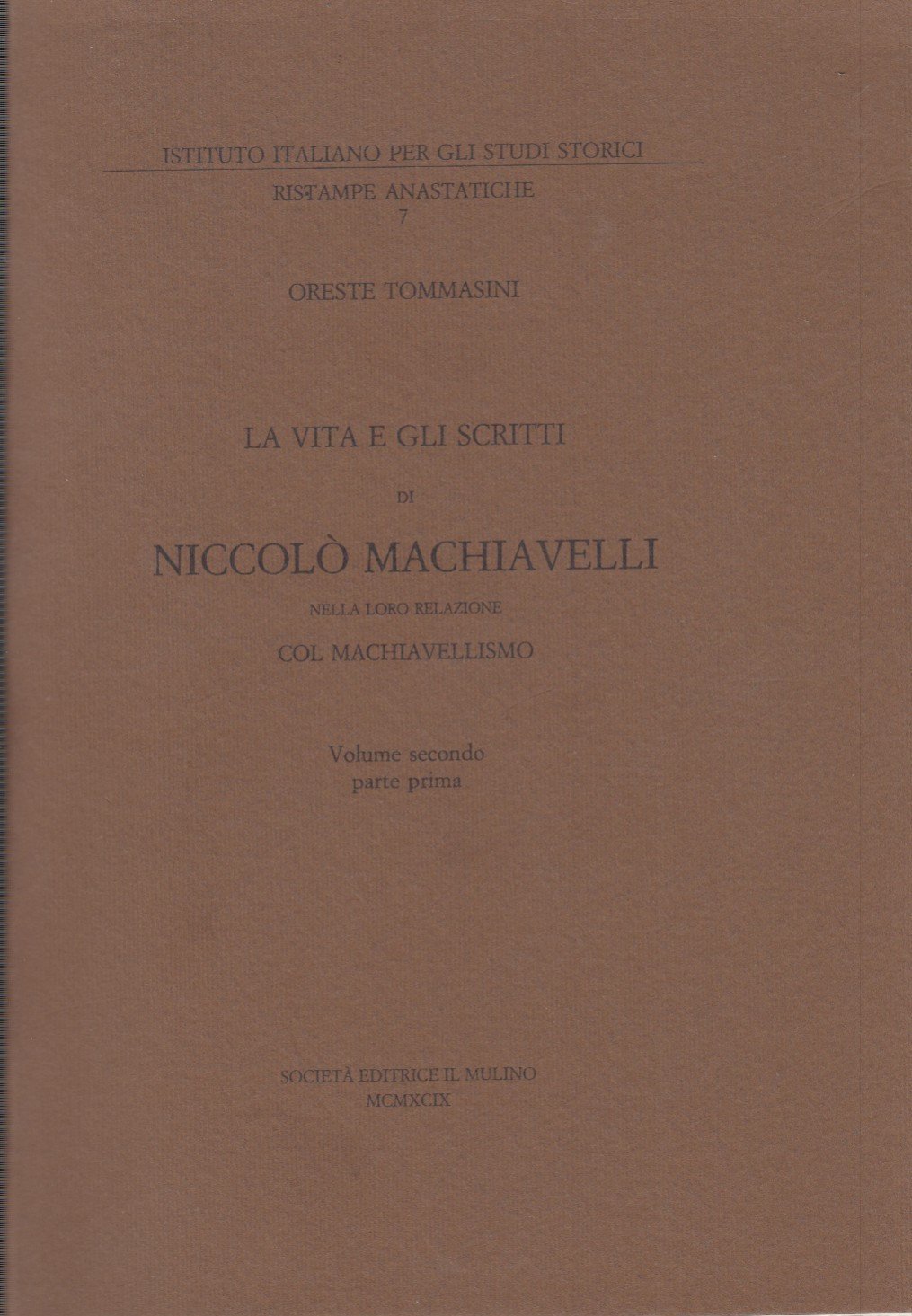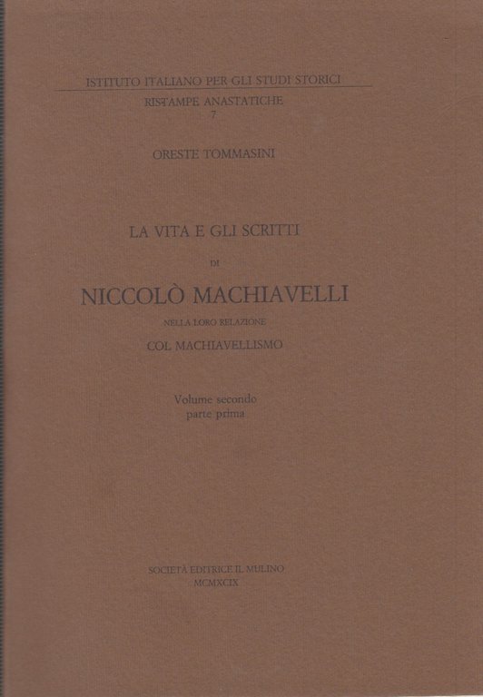 <p><span style="font-family:Helvetica;"><span style="font-size:14pt;word-spacing:normal;"></span></span></p><p><span style="font-family:Helvetica;"><span style="font-size:14pt;word-spacing:normal;"><br /></span></span></p><p><span style="font-family:Helvetica;"><span style="font-size:14pt;word-spacing:normal;">Tommasini Oreste: La vita e gli scritti di Niccolò Machiavelli nella loro relazione col Machiavellismo, Volume secondo, parte prima. Società Editrice Il Mulino, 1999</span></span></p><p><span style="font-family:Helvetica;"><span style="font-size:18.6667px;">In-8 (Cm 25 x 17), pp. XXVII-964, brossura editoriale. Collana dell'Istituto Italiano per gli Studi Storici. Ristampa anastatica dell'edizione Loescher del 1911. COME NUOVO</span></span></p>