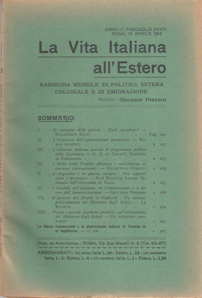 In-8 (Cm 25 x 17), pp. da 241 a 320, brossura editoriale. Normali segni del tempo. MOLTO BUONO - Sommario: Francesco Evoli: In margine della guerra - Mario Alberti: L'insuccesso dell'espansionismo germanico - G.A. di Cesarò: L'alleanza italiana secondo il programma politico della Germania - Francesco Foberti: L'Italia nella triplice alleanza e nell'odierna situazione internazionale - Eteocle Lorini: L'Argentina e la guerra europea, fra supposizioni e pronostici - Giovanni Preziosi: I risultati dell'inchiesta sul Commissariato e il dovere dell'Amministrazione - Il pericolo del Brasile di riaffaccia. Un dannosolo provvedimento del ministero degli esteri - Piccole e grandi questioni pratiche sull'ordinamento del Ministero degli Esteri. G.Pr.: La Banca Commerciale e la penetrazione tedesca in Francia e in Inghilterra