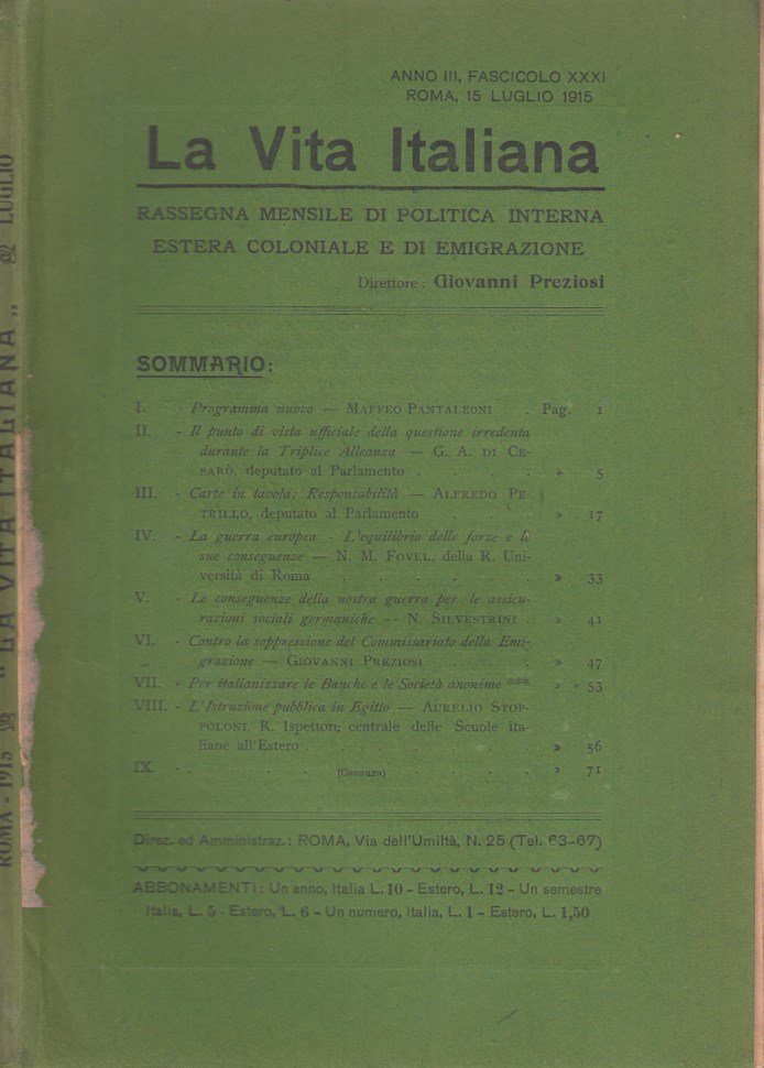 In-8 (Cm 25 x 17), pp. da 1 a 96, brossura editoriale. Normali segni del tempo. MOLTO BUONO - Sommario: Maffeo Pantaleoni: Programma nuovo - G.A. di Cesarò: Il punto di vista ufficiale della questione irredenta durante la triplice alleanza - Alfredo Petrillo: Carte in tavola: Responsabilità - N.M. Fovel: La guerra europea, l'equilibro delle forze e le sue conseguenze - Silvestrini: Le conseguenze della nostra guerra per le assicurazioni sociali germaniche - Giovanni Preziosi: Contro la soppressione del commissariato della emigrazione - Per italianizzar le Banche e le società anonime , Aurelio Stoppoloni: L'istruzione pubblica in Egtitto - Censura