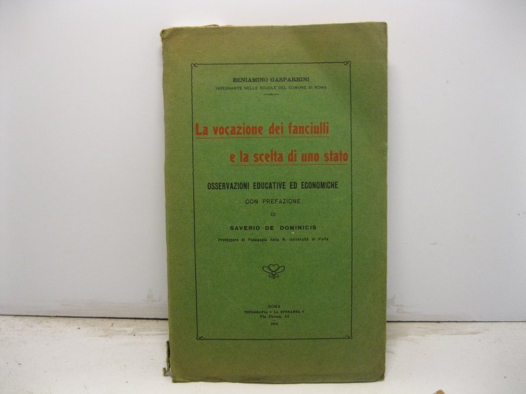 La vocazione dei fanciulli e la scelta di uno stato. Osservazioni educative ed economiche con prefazione di Saverio De Dominicis professore di pedagogia nella R. Universita' di Pavia