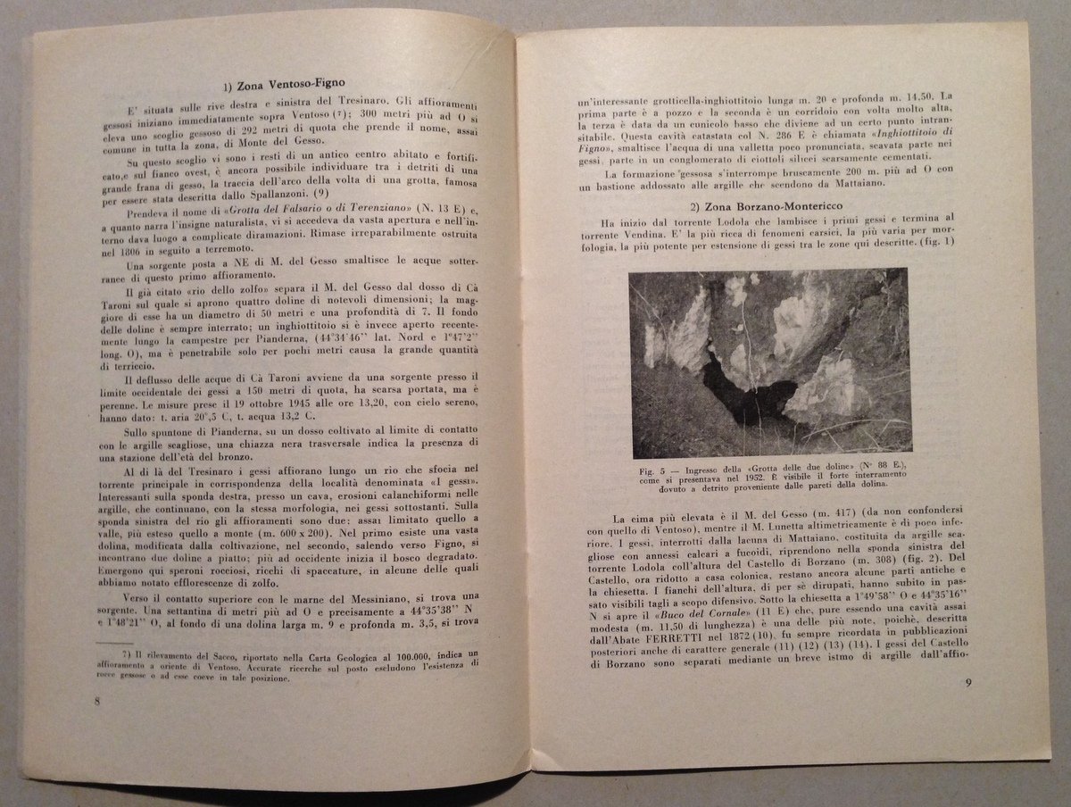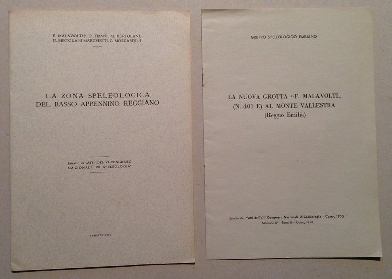 Opuscoli, La zona speleologica del Basso Appennino Reggiano ------------------------------------------------ La nuova grotta F. Malavolti" (n. 401 E) al Monte Vallestra (Reggio Emilia) 2 Fascicoli, Estratto da Atti del Congresso Nazionale di Speleologia: Trieste 1954, Como 1956; cm. 24.5x17, pp. 31, 7; con ill. in b/n n.t. e a p.pag.; br. ed. Condizioni di conservazione Esemplari in buono stato con leggere tracce d'uso. OPEB.3839 MT "