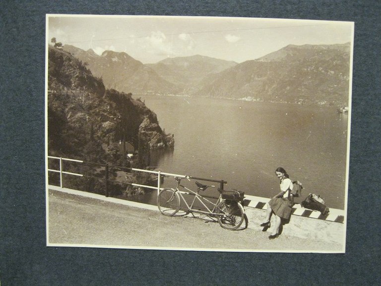Fotografia originale in b/n vintage, stampa alla gelatina ai sali d'argento, didascalia manoscritta al verso, misura cm 11,5 x 9 montata su cartoncino bordato cm 16,5 x 23 ritrae una veduta verso la valle d'Intelvi con vista sul lago di Como. In primo piano una donna accanto ad una bicicletta tandem con bagaglio legato sulla sella.