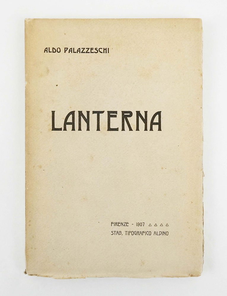 LIBRO Edizione originale. Ottimo esemplare dalla collezione di Luce Marinetti, come da timbro ex libris; ancora a fogli chiusi, normalmente brunito sul dorso e con qualche occasionale fioritura. Rara opera seconda pubblicata a proprie spese come la prima rarissima raccolta, «I cavalli bianchi». Uscita nel 1907, essa appartiene al primo periodo di Aldo Palazzeschi, ancora immerso in atmosfere simboliste e legato a gusto e stile tardo ottocenteschi. Aperta da «Torre burla» e chiusa da «La Gavotta di Kirò», la silloge è formata da quindici liriche di media lunghezza e della suite «Rosario» (con componimenti di tre versi ciascuno). -- Nel corso del 1909 Palazzeschi aderisce al futurismo e rimette in circolo due delle sue prime cose («Lanterna» e «Riflessi») con l’etichetta delle edizioni di Marinetti: Cammarota circoscrive precisamente questa nuova emissione a soli 250 esemplari. -- «Può anche darsi che sia una certa pittura metafisica scritta, a nascere con “Lanterna” [.], dove la figurazione è per certo quella dell’ultimo Segantini, cioè del primo Boccioni, ma i risultati anticipano quel che De Chirico dipingerà anni dopo, discorsi del subconscio e dell’intelletto formulati per immagini [.]» (Viazzi, Dal simbolismo al déco, p. 201). Cammarota, Futurismo, 356.2