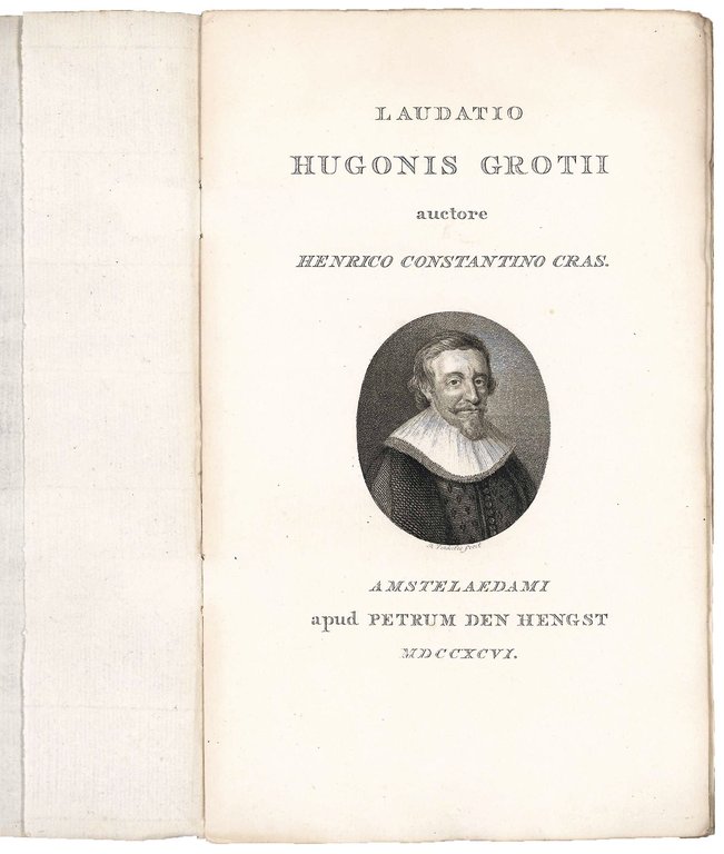 8vo (225x135 mm). [2], VIII, 88 pp. Engraved portrait of Grotius by Reinier Vinkeles in oval window on title page. The title page, printed on heavier paper with horizontal chainlines, served probably originally as the upper cover. The half title page that follows, reads: Laudatio Hugonis Grotiim ad Academiae Regiae quae historiarum, eloquentiae, antiquitatis, atque inscriptionum studiis ac laude Holmiae apud Sueones floret moderatores. Auctore Henrico Constantino Cras: cui palma adjudicata est mense Aprili anni MDCCXCVI. Includes bibliographical references. Original cardboards. A nearly perfect copy, uncut and partly unopened.