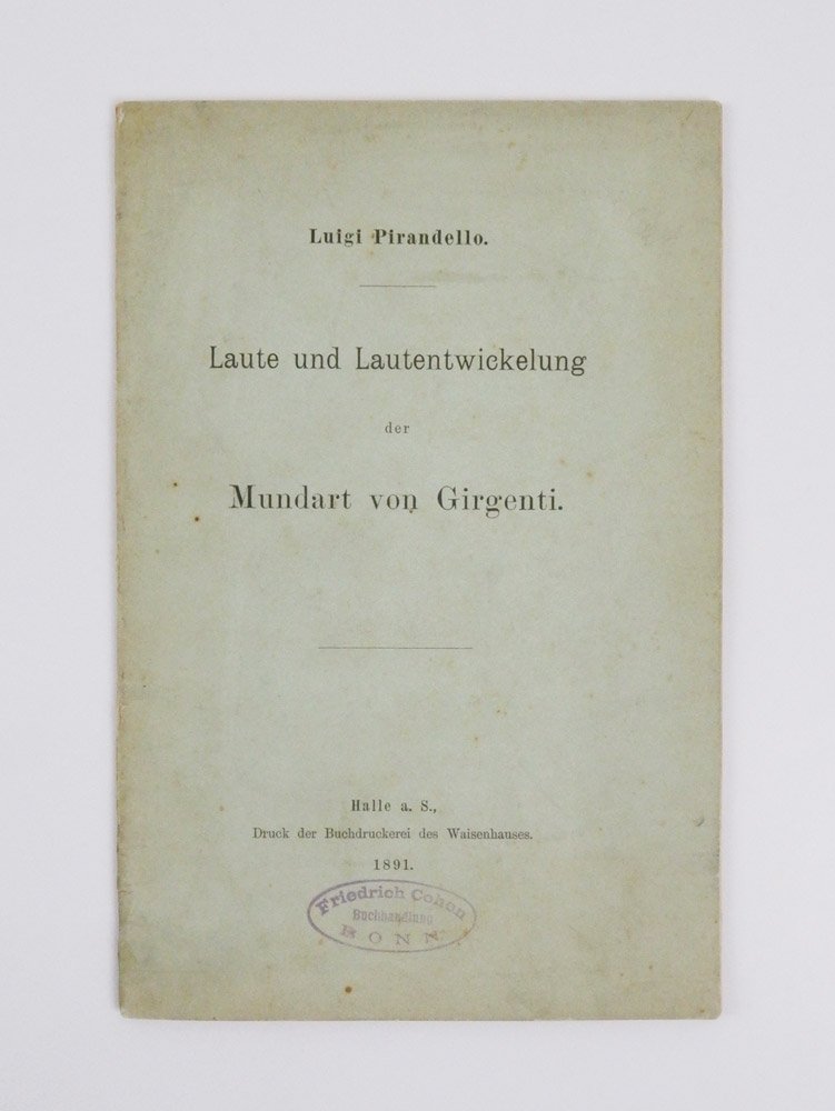 LIBROPrima edizione della tesi di Pirandello, nella rarissima emissione “in forma di libro”.Ottimo esemplare, nella sua brossura originale, senza sofisticazioni. Timbro di appartenenza dell’epoca («Friedrich Cohen») al piatto anteriore.Nel marzo del 1891 Pirandello fece stampare presso la «Tipografia dell’Orfanotrofio» di Halle la sua tesi di laurea sul dialetto di Agrigento: alla brossura erano indicati non solo i dati bibliografici, ma anche tutti i dati dell’università, precisi riferimenti ai nomi dei commissari di tesi e addirittura alla data e all’orario della discussione. Insomma, la pubblicazione aveva l’aspetto delle comuni tesi di laurea che ancora oggi si vedono nelle aule universitarie. In fine, inoltre, alle pp. 50-52, vennero inseriti anche il curriculum del laureando e le «Thesen» (gli argomenti di discussione). Pirandello decise però di stampare anche un’emissione differente, che avesse l’aspetto di un vero e proprio libro: il testo rimase in tutto identico, ma alla brossura e al frontespizio furono conservati solo il titolo e i dati bibliografici, eliminando dunque tutti i riferimenti alla discussione e i dati dell’università. E ancora, Pirandello sostituì le pagine finali, contenenti il suo curriculum e le «Thesen», con una sua recensione del «Saggio di fonetica siciliana» di Giacomo De Gregorio. Nencioni fotografa la situazione parlando di esemplari «non ufficiali e tirati successivamente», ma è verosimile si tratti di emissioni differenti, volute entrambe dall’autore, di un’unica tiratura originale. -- L’emissione “in forma di libro” risulta di estrema rarità: ne è censito un solo esemplare nella Biblioteca “Bombace” di Palermo. -- Pirandello discusse la sua tesi di laurea in filologia romanza, dedicata alla fonetica del dialetto del Girgenti, a Bonn il 21 marzo 1891. La sua carriera universitaria era iniziata nel 1886 alla Facoltà di Lettere di Palermo; da lì, dopo un anno, si era trasferito alla “Sapienza” di Roma, dove insegnava il grande maestro Ernesto Monaci: rimastone affascinato, Pirandello indirizzò dunque i suoi studi verso la filologia e la linguistica romanza. Un diverbio tanto banale quanto aspro con il professore di latino, Onorato Occioni, lo costrinse però ad allontanarsi da Roma, consigliato in questo senso anche da Monaci, preoccupato che Occioni, preside della facoltà, potesse in qualche modo ostacolare l’allievo. Il 6 novembre 1889 Pirandello approdò dunque alla Rheinische Friedrich-Wilhelms-Universität, con tutta probabilità spinto proprio dal suo maestro: a Bonn, infatti, insegnava Wendelin Förster, importante storico della lingua e dialettologo, oltre che collega e amico del Monaci. Sempre a Bonn, aveva insegnato il fondatore della linguistica romanza, Friedrich Diez, a cui Förster era succeduto. La Friedrich-Wilhelms costituiva, in quel periodo, la culla e il centro di irradiazione della disciplina a cui Pirandello aveva rivolto i suoi interessi di studioso. L’argomento della tesi fu scelto molto rapidamente, forse già prima dell’arrivo a Bonn: per condurre la sua ricerca Pirandello non si limitò allo studio della bibliografia pregressa, ma allargò l’analisi ai suoi stessi ricordi del dialetto siciliano, scrisse numerose lettere al fratello e agli amici chiedendo informazioni sulla pronuncia di alcune parole e le trascrizioni di canzoni popolari, racconti e poesie, e infine trascorse l’estate del 1890 in Sicilia, raccogliendo quanto più materiale possibile. La tesi di Pirandello fu giudicata «observatione accurata et docta, sed expositione probabilis», mentre il commento alla discussione orale fu «rite superavit». Considerato che il lavoro fu portato a termine in breve tempo, la valutazione è da intendersi come notevolmente positiva. -- L’attività di filologo romanzo di Pirandello si interruppe con il rientro in Italia, ma in qualche modo, ironicamente, lo scrittore aveva già preso le distanze dallo studioso: «L’altro, eccolo in Germania, a Bonn sul Reno, / sotto un cappello di castoro, enorme: / magro egro smunto: non mangia, non dorme; / studia sul serio (o cosí crede almeno) / del linguaggio le origini e le forme», scrive nella poesia «Convegno», composta a Bonn e pubblicata sulla «Rivista d’Italia» nel 1901. E tuttavia, la formazione filologica di Pirandello si riverbera su tutta la sua produzione letteraria: «Se lasciò le ricerche tecniche, conservò vivissima la coscienza della lingua come nodo problematico e la tenne al centro della sua teoresi letteraria e artistica. Più di un critico ha giustamente rilevato quanta tradizione letteraria condizioni e alimenti lo scrivere pirandelliano, specie nelle poesie e nelle novelle, e quanto Pirandello artista sia legato a Pirandello “filologo”» (Nencioni, p. 18).Lo Vecchio Musti, Bibliografia di Pirandello (Milano 1952), n. 21; L. Pirandello, Fonetica e sviluppo fonico del dialetto di Girgenti, intr. G. Nencioni, trad. E. Cetrangolo (Roma 1984); L. Pirandello, The Sounds of the Girgenti Dialects and Their Development, ed. by G.R. Bussino (New York 1992)