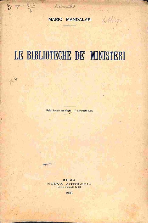 In 8 (cm 16 x 24,54), pp. 12. Brossura editoriale. Estratto editoriale dalla Nuova Antologia. Saggio breve sulla Biblioteche ministeriali fra le quali quella del Ministero dei Lavori pubblici, dell'Interno, degli Affari esteri, delle Finanze e del Tesoro, della Guerra, della Marina, di Grazie e Giustizia; ecc.