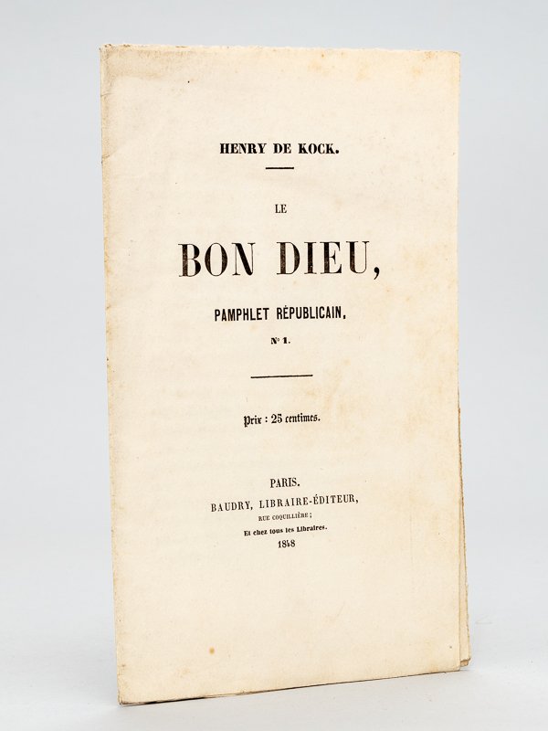 1 brochure in-8, Baudry, Paris, 1848, 16 pp. Rare et bon exemplaire de cette brochure républicaine rédigée par le fils de Paul de Kock. Il faut citer l'auteur pour expliquer le titre : "Dieu nous a dit en nous mettant sur terre : "Aimez-vous et aidez-vous les uns les autres". Dieu est donc essentiellement républicain. Il faut être égaux pour s'aimer et s'aider mutuellement, et il n'y a d'égalité possible que sous un gouvernement républicain".